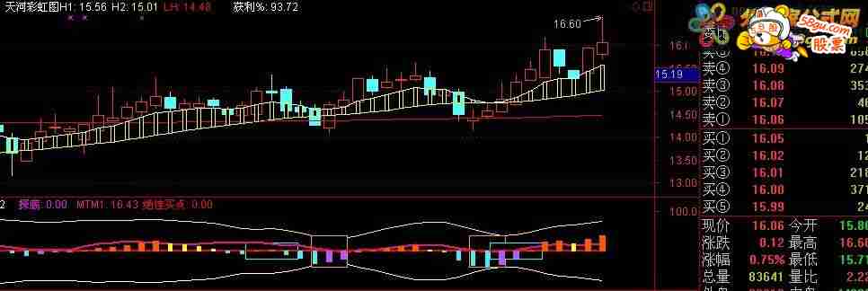 黑码白金-主图用法:当白线上穿黄线时为买点,出现黄柱子逐渐放大看涨股价站上红线为强势;反之,为卖点,出现蓝柱子并逐渐放大为弱势。天河彩虹图H1:EMA(CLOSE,8);H2:EMA(天河彩虹图H1,20);LH:EMA(CLOSE,240),COLORRED;VAR1:=(HHV(HIGH,36)-CLOSE)/(HHV(HIGH,36)-LLV(LOW,36))*100;VAR2:=SMA(VAR1,5,1);VAR3:=SMA(VAR2,8,1);VAR4:=CROSS(VAR2,VAR3) AND VAR3<20;VAR5:=CLOSE>LLV(CLOSE,60)+0.3*LLV(CLOSE,60) AND VAR4;VAR6:=IF(CLOSE>1000,VAR4,VAR5);DRAWICON(CROSS(天河彩虹图H1,H2) AND CLOSE<EMA(CLOSE,60),LOW,1);DRAWICON(VAR6,H,2);STICKLINE(天河彩虹图H1>H2,天河彩虹图H1,H2,1,1),COLORYELLOW;STICKLINE(天河彩虹图H1<H2,天河彩虹图H1,H2,1,1),COLORBLUE;  |