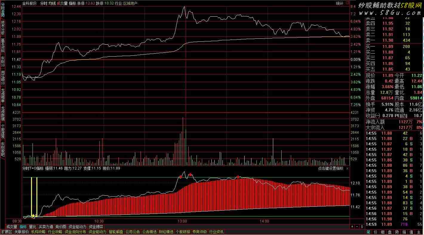 MA30:=EMA(CLOSE,30); 强弱:EMA(CLOSE,900); STICKLINE((MA30>强弱),MA30,强弱,1,0),COLOR0000FF; STICKLINE((MA30<强弱),MA30,强弱,1,0),COLOR00FF00; H1:=MAX(DYNAINFO(3),DYNAINFO(5)); L1:=MIN(DYNAINFO(3),DYNAINFO(6)); P1:=H1-L1; 阻力:L1+P1*7/8,COLOR00DD00; 支撑:L1+P1*0.5/8,COLOR00DD00; 现价:CLOSE,COLORWHITE,LINETHICK1; STICKLINE(CROSS(支撑,现价),支撑,阻力,1,0),COLORYELLOW; DRAWTEXT(LONGCROSS(支撑,现价,2),支撑*1.001,'★B'),COLORYELLOW;{吸} DRAWTEXT(LONGCROSS(现价,阻力,2),现价,'★'),COLORRED;{抛};