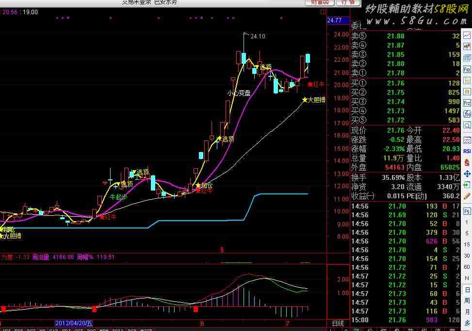A:=(3*C+L+O+H)/6;X:=(20*A+19*REF(A,1)+18*REF(A,2)+17*REF(A,3)+16*REF(A,4)+15*REF(A,5)+14*REF(A,6)+13*REF(A,7)+12*REF(A,8)+11*REF(A,9)+10*REF(A,10)+9*REF(A,11)+8*REF(A,12)+7*REF(A,13)+6*REF(A,14)+5*REF(A,15)+4*REF(A,16)+3*REF(A,17)+2*REF(A,18)+REF(A,20))/210;RCC:=DYNAINFO(3);S2:=SMA(C,3,1);S6:=SMA(C,5,1);DK:=2*(S2-S6);主力成本:EMA(X,13),COLORFF00FF,LINETHICK0;短期底部:LLV(HIGH,30),LINETHICK2,COLORFFCC00;IF(MA(C,3),MA(C,3),DRAWNULL),COLORYELLOW,LINETHICK2;IF(MA(C,9),MA(C,9),DRAWNULL),COLORMAGENTA,LINETHICK2;IF(MA(C,23.5),MA(C,23.5),DRAWNULL),COLORWHITE;DRAWKLINE(HIGH,OPEN,LOW,CLOSE);MA5:=MA(C,5);MA10:=MA(C,10);MA30:=MA(C,30);FA:=BARSLAST(CROSS(MA10,MA5)) AND CROSS(MA5,MA10);FB:=FA AND MA5>MA30 AND MA10>MA30 AND MA10>REF(MA10,1);DRAWTEXT(FB,L-0.58,'★红牛'),COLORRED;V1:=EMA(CLOSE,5);V2:=EMA(EMA(CLOSE,90)*1.01,10);DRAWTEXT(CROSS(V1,V2),V1+0.05,'牛起步'),COLOR00FF00;VAR1:=LLV(LOW,21);VAR2:=HHV(HIGH,21);AK1:=EMA((((CLOSE - VAR1) / (VAR2 - VAR1)) * 100),5);AK:=EMA((((CLOSE - VAR1) / (VAR2 - VAR1)) * 50),13);AB:=CROSS(AK1,AK);DRAWTEXT((AB = 1),(LOW * 0.99),'○牛窝'),COLORYELLOW;AA1:=AMOUNT/V;BB1:=L<AA1*0.9;CC1:=(C-REF(C,1))/REF(C,1)*100>1.2;DD1:=L<MA(C,5)*0.921;EE1:=V<MA(V,5)*1.5;老鼠仓:=BB1 AND CC1 AND DD1 AND EE1,LINETHICK0,COLOR0099FF;DRAWTEXT(老鼠仓,L*0.99,'老鼠仓'),COLOR0099FF;VAR3AA:=IF((CLOSE>REF(CLOSE,1)),88,0);VAR4AA:=IF(((CLOSE)/(REF(CLOSE,1))>1.05) AND ((HIGH)/(CLOSE)<1.01) AND (VAR3AA>0),91,0);DRAWTEXT(FILTER((VAR4AA>90),45),(LOW)*(0.93),'★大胆搏 '),COLOR00FFFF;DRAWTEXT(FILTER((VAR4AA>90),35),(LOW)*(0.99000001),'★加仓'),COLOR00FFFF;A1AA:=9;A2AA:=(REF(CLOSE,A1AA+1)<CLOSE);DRAWTEXT(FILTER((A2AA>-0.5),84),(HIGH)*(1.05),'小心变盘'),COLORFFFFFF;VAR6:=REF(C,1);VAR7:=SMA(MAX(C-VAR6,0),6,1)/SMA(ABS(C-VAR6),6,1)*100;DRAWTEXT(CROSS(82,VAR7),H*1.01,'▼逃顶'),COLORYELLOW; |