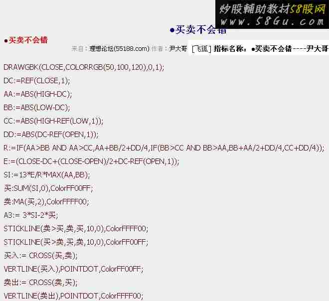 买卖不会错 【源码、副图、附图、说明】 说明;[飞狐] 指标名称:●买卖不会错----尹大哥 作品公式要在通达信 4.17版本以上才可以导入使用