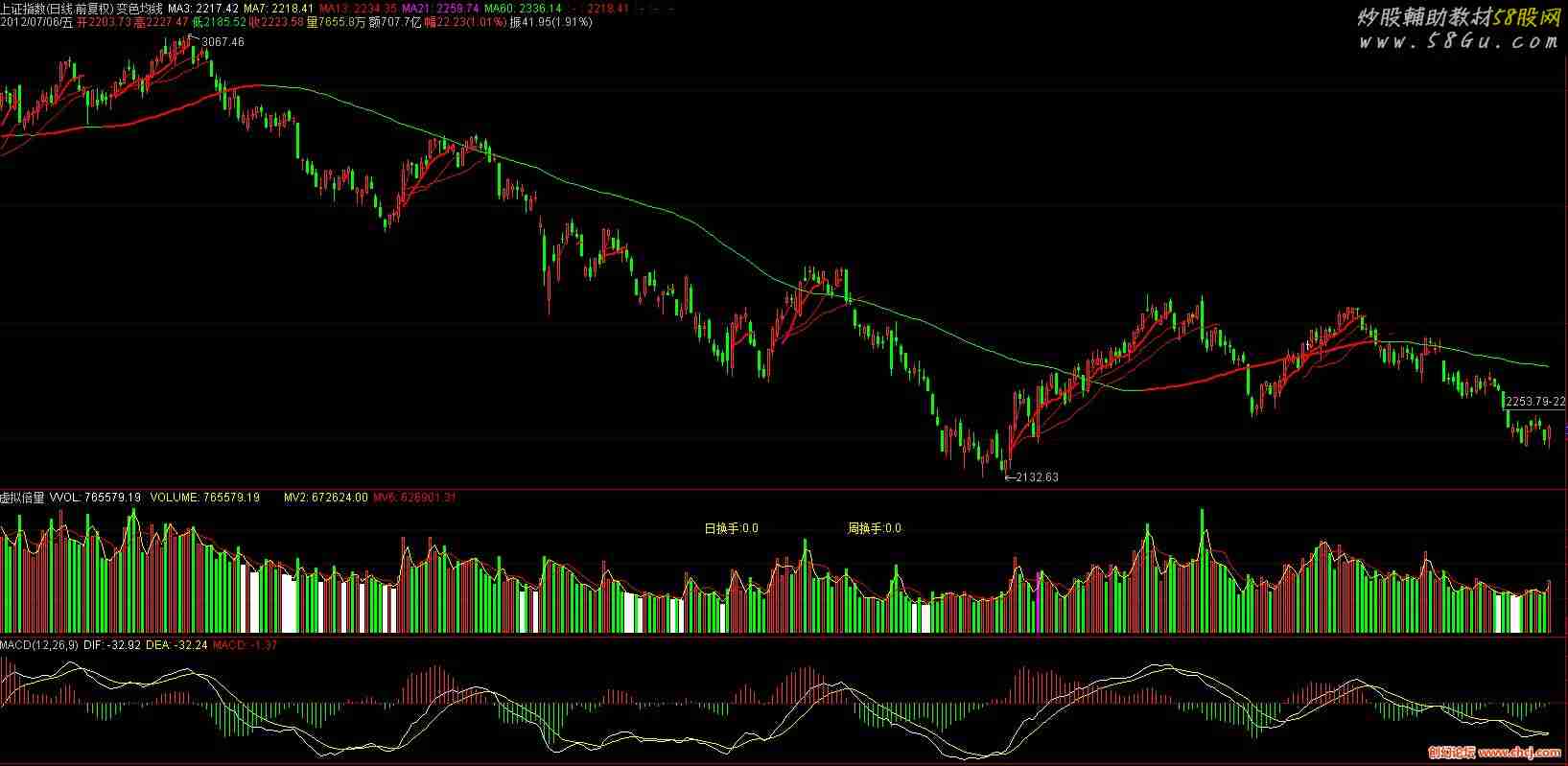 MA3:MA(C,3),COLOR00FF00,LINETHICK0; MA7:MA(C,7),COLOR00FF00,LINETHICK0; MA13:MA(C,13),COLOR00FF00,LINETHICK0; MA21:MA(C,21),COLOR00FF00,LINETHICK0; MA60:MA(C,60),COLOR00FF00,LINETHICK1; IF(MA(C,3)>=REF(MA(C,3),1),MA(C,3),DRAWNULL),COLORRED,LINETHICK1; IF(MA(C,7)>=REF(MA(C,7),1),MA(C,7),DRAWNULL),COLORRED,LINETHICK2; IF(MA(C,13)>=REF(MA(C,13),1),MA(C,13),DRAWNULL),COLORRED,LINETHICK1; IF(MA(C,21)>=REF(MA(C,21),1),MA(C,21),DRAWNULL),COLORRED,LINETHICK1; IF(MA(C,60)>=REF(MA(C,60),1),MA(C,60),DRAWNULL),COLORRED,LINETHICK2;