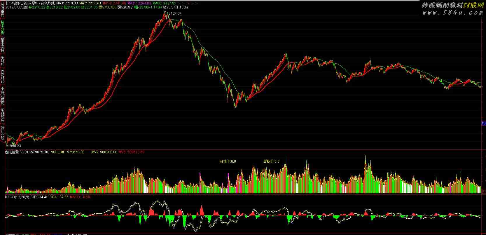 MA3:MA(C,3),COLOR00FF00,LINETHICK0;MA7:MA(C,7),COLOR00FF00,LINETHICK0;MA13:MA(C,13),COLOR00FF00,LINETHICK0;MA21:MA(C,21),COLOR00FF00,LINETHICK0;MA60:MA(C,60),COLOR00FF00,LINETHICK1;IF(MA(C,3)>=REF(MA(C,3),1),MA(C,3),DRAWNULL),COLORRED,LINETHICK1;IF(MA(C,7)>=REF(MA(C,7),1),MA(C,7),DRAWNULL),COLORRED,LINETHICK2;IF(MA(C,13)>=REF(MA(C,13),1),MA(C,13),DRAWNULL),COLORRED,LINETHICK1;IF(MA(C,21)>=REF(MA(C,21),1),MA(C,21),DRAWNULL),COLORRED,LINETHICK1;IF(MA(C,60)>=REF(MA(C,60),1),MA(C,60),DRAWNULL),COLORRED,LINETHICK2; |