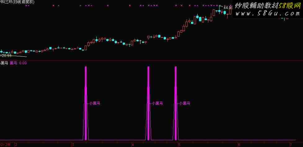 A:=V*100/CAPITAL; 小黑码:=MA(A,180); DIFF0:=(EMA(DCLOSE,12)-EMA(DCLOSE,26))*100; DEA0:=EMA(DIFF0,9); MACD0:=2*(DIFF0-DEA0); 黑码:(MACD0>REF(MACD0,1)*2.5 AND MACD0>15),COLORFF00FF; STICKLINE(黑码,00,1,1.2,0),COLORMAGENTA; DRAWTEXT(黑码,0.5,'←小黑码'),COLORMAGENTA; |
