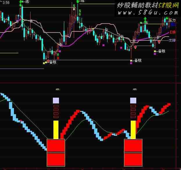 {★底部提示:通用}VAR2:=(CLOSE-LLV(LOW,20))/(HHV(HIGH,20)-LLV(LOW,20))*100;VAR3:=SMA(SMA(VAR2,3,1),3,1)/28.57;VAR4:=EMA(VAR3,5);VAR5:=3*VAR3-2*VAR4;AA:=CROSS(VAR5,VAR3) AND VAR3<2.1 AND C>O;VAR6:=(2*CLOSE+HIGH+LOW)/4;VAR7:=LLV(LOW,13);VAR8:=HHV(HIGH,13);VAR9:=EMA((VAR6-VAR7)/(VAR8-VAR7)*100,13);VARA:=EMA(0.667*REF(VAR9,1)+0.333*VAR9,2);多:VAR9,COLORRED,POINTDOT;空:EMA(0.382*REF(VAR9,2)+0.618*VAR9,12),COLORGREEN;STICKLINE(VAR9>VARA,VAR9,VARA,6,0),COLORRED;STICKLINE(VAR9<=VARA,VAR9,VARA,6,0),COLORFFCC66;STICKLINE(AA,0,30,40,1),COLORYELLOW;STICKLINE(AA,16,29,38,0),COLORRED;STICKLINE(AA,1,14,38,0),COLORRED;STICKLINE(AA,15,15,40,1),COLORYELLOW;STICKLINE(AA,30,50,10,0),COLORYELLOW;STICKLINE(AA,53,55,10,1),COLORRED;STICKLINE(AA,57,59,10,1),COLORRED;STICKLINE(AA,61,63,10,1),COLORRED;STICKLINE(AA,65,67,10,1),COLORRED;STICKLINE(AA,69,75,12,0),COLORFFCCCC;DRAWTEXT(AA,85,'底'),COLORYELLOW; |