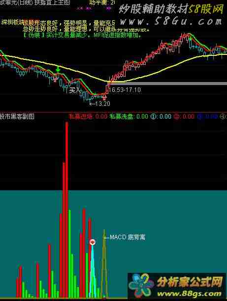 STICKLINE(100,90,0,5,0),COLOR666600;XIAO1:=REF((LOW+OPEN+CLOSE+HIGH)/4,1); XIAO2:=SMA(ABS(LOW-XIAO1),13,1)/SMA(MAX(LOW-XIAO1,0),10,1); XIAO3:=EMA(XIAO2,10); XIAO4:=LLV(LOW,33); XIAO5:=EMA(IF(LOW<=XIAO4,XIAO3,0),3); STICKLINE(XIAO5>REF(XIAO5,1),0,XIAO5,3,0 ),COLOR000055;STICKLINE(XIAO5>REF(XIAO5,1),0,XIAO5,2.6,0 ),COLOR000077; STICKLINE(XIAO5>REF(XIAO5,1),0,XIAO5,2.1,0 ),COLOR000099; STICKLINE(XIAO5>REF(XIAO5,1),0,XIAO5,1.5,0 ),COLOR0000BB; STICKLINE(XIAO5>REF(XIAO5,1),0,XIAO5,0.9,0 ),COLOR0000DD; STICKLINE(XIAO5>REF(XIAO5,1),0,XIAO5,0.3,0 ),COLOR0000FF; STICKLINE(XIAO5<REF(XIAO5,1),0,XIAO5,3,0),COLOR005500; STICKLINE(XIAO5<REF(XIAO5,1),0,XIAO5,2.6,0),COLOR007700; STICKLINE(XIAO5<REF(XIAO5,1),0,XIAO5,2.1,0),COLOR009900; STICKLINE(XIAO5<REF(XIAO5,1),0,XIAO5,1.5,0),COLOR00BB00; STICKLINE(XIAO5<REF(XIAO5,1),0,XIAO5,0.9,0),COLOR00DD00; STICKLINE(XIAO5<REF(XIAO5,1),0,XIAO5,0.3,0),COLOR00FF00; 私募进场:IF(XIAO5>REF(XIAO5,1),XIAO5,0),COLORRED,NODRAW; 私募洗盘:IF(XIAO5<REF(XIAO5,1),XIAO5,0),COLORGREEN,NODRAW;B1:=(HHV(H,9)-C)/(HHV(H,9)-LLV(LOW,9))*100- 70; B2:=SMA(B1,9,1)+100; B3:=(C-LLV(L,9))/(HHV(H,9)- LLV(L,9))*100; B4:=SMA(B3,3,1); B5:=SMA(B4,3,1)+100; B6:=B5-B2; 观望期:=IF(B6>60,B6-60,0); T1:=STICKLINE(REF(观望期,1)<观望期,观望期,REF(观望期,1),9,0),COLORYELLOW; T2:=STICKLINE(REF(观望期,1)>观望期,观望期,REF(观望期,1),9,0),COLORCYAN; TAI1:=MA(C,1)/MA(REF(C,13),8)*100; TAI2:=MA(FORCAST(TAI1,21),3); TAI3:=REF(TAI1,1); TAI4:=REF(TAI1,2); 邰1:=LLV(LOW,8); 邰2:=HHV(HIGH,13); 股市黑客:= EMA((CLOSE-邰1)/(邰2-邰1)*100,5),COLORRED; 升跌临界:= EMA(0.667*REF(股市黑客,1)+0.333*股市黑客,2),COLORGREEN; VAR1:=(CLOSE>REF(CLOSE,1) AND CLOSE>REF(CLOSE,2)); VARD:=(CLOSE<REF(CLOSE,1) AND CLOSE<REF(CLOSE,2)); VARE:=(REF(VARD,1) AND CLOSE>=REF(CLOSE,1) AND CLOSE<=REF(CLOSE,2)); VARF:=(REF(VARE,1) AND CLOSE<=REF(CLOSE,1) AND CLOSE>=REF(CLOSE,2)); VAR10:=(REF(VARF,1) AND CLOSE>=REF(CLOSE,1) AND CLOSE<=REF(CLOSE,2)); VAR11:=(REF(VAR10,1) AND CLOSE<=REF(CLOSE,1) AND CLOSE>=REF(CLOSE,2)); VAR12:=(REF(VAR11,1) AND CLOSE>=REF(CLOSE,1) AND CLOSE<=REF(CLOSE,2)); VAR13:=(REF(VAR12,1) AND CLOSE<=REF(CLOSE,1) AND CLOSE>=REF(CLOSE,2)); VAR14:=(REF(VAR13,1) AND CLOSE>=REF(CLOSE,1) AND CLOSE<=REF(CLOSE,2)); VAR15:=(REF(VAR14,1) AND CLOSE<=REF(CLOSE,1) AND CLOSE>=REF(CLOSE,2)); VAR16:=(REF(VAR15,1) AND CLOSE>=REF(CLOSE,1) AND CLOSE<=REF(CLOSE,2)); VAR17:=(REF(VAR16,1) AND CLOSE<=REF(CLOSE,1) AND CLOSE>=REF(CLOSE,2)); VAR18:=(REF(VAR17,1) AND CLOSE>=REF(CLOSE,1) AND CLOSE<=REF(CLOSE,2)); VAR19:=REF(VARD OR VARE OR VARF OR VAR10 OR VAR11 OR VAR12 OR VAR13 ORVAR14 OR VAR15 OR VAR16 OR VAR17 OR VAR18,1) AND VAR1; DIFF:=EMA(DCLOSE,12)-EMA(DCLOSE,26);DEA:=EMA(DIFF,9),COLORFFFF00; MACD:=(DIFF-DEA)*2; A1:=BARSLAST(REF(CROSS(DIFF,DEA),1)); A2:=BARSLAST(REF(CROSS(DEA,DIFF),1)); 底背离:=REF(CLOSE,A1+1)>CLOSE AND DIFF> REF(DIFF,A1+1) AND CROSS(DIFF,DEA); 顶背离:=REF(CLOSE,A2+1)< CLOSE AND REF(DIFF,A2+1)>DIFF AND CROSS(DEA,DIFF); ①:IF(REF((MA(C,5)-C)/C>0.04 AND (MA(C,10)-MA(C,5)) /MA(C,5)>0.04 AND观望期=0 AND C> REF(C,1),1),44,0),LINETHICK3,COLORCYAN; {通达信指标公式}②:IF(REF("KDJ.J",1)<0 AND "KDJ.J">0 AND TAI1>=TAI2 ANDTAI3> TAI4,34,0),LINETHICK3,COLOR0000FF; ③:IF(REF(股市黑客,1)<=13&&CROSS(股市黑客,升跌临界)&&REF(MA(C,55),1)>REF(MA(C,55),2)&& (VAR19 OR REF(VAR19,1)),23,0),COLORBLUE; ④:IF(底背离,57,0),LINETHICK3,COLORBROWN; DRAWTEXT(底背离,54,'←MACD 底背离'),COLORWHITE; DRAWICON(REF(股市黑客,1)<=13&&CROSS(股市黑客,升跌临界)&&REF(MA(C,55),1)>REF(MA(C,55),2)&&(VAR19 OR REF(VAR19,1)),25,23); DRAWICON(REF((MA(C,5)-C)/C>0.04 AND (MA(C,10)-MA(C,5)) /MA(C,5)>0.04AND 观望期=0 AND C>REF(C,1),1),46,23); DRAWICON(REF("KDJ.J",1)<0 AND "KDJ.J">0 AND TAI1>=TAI2 ANDTAI3>TAI4,36,23),COLORYELLOW; |