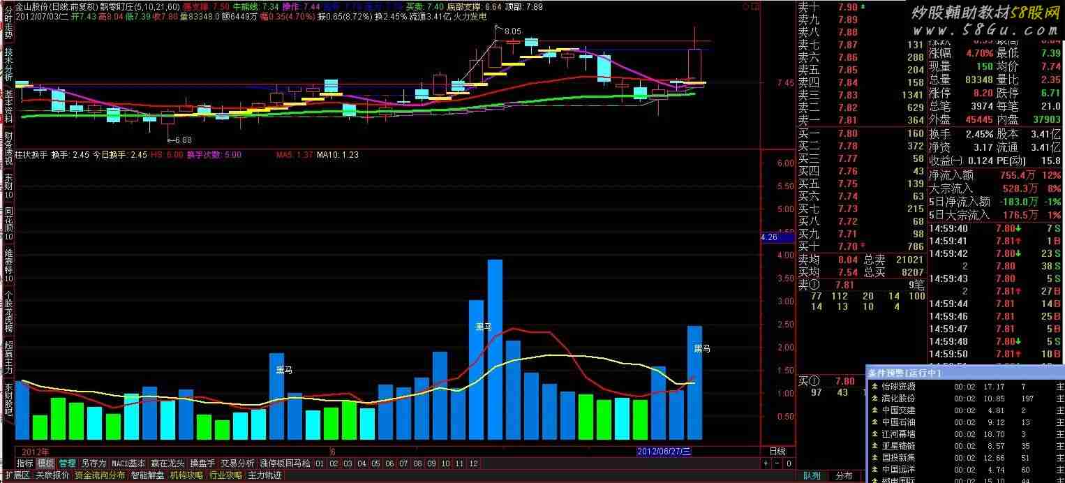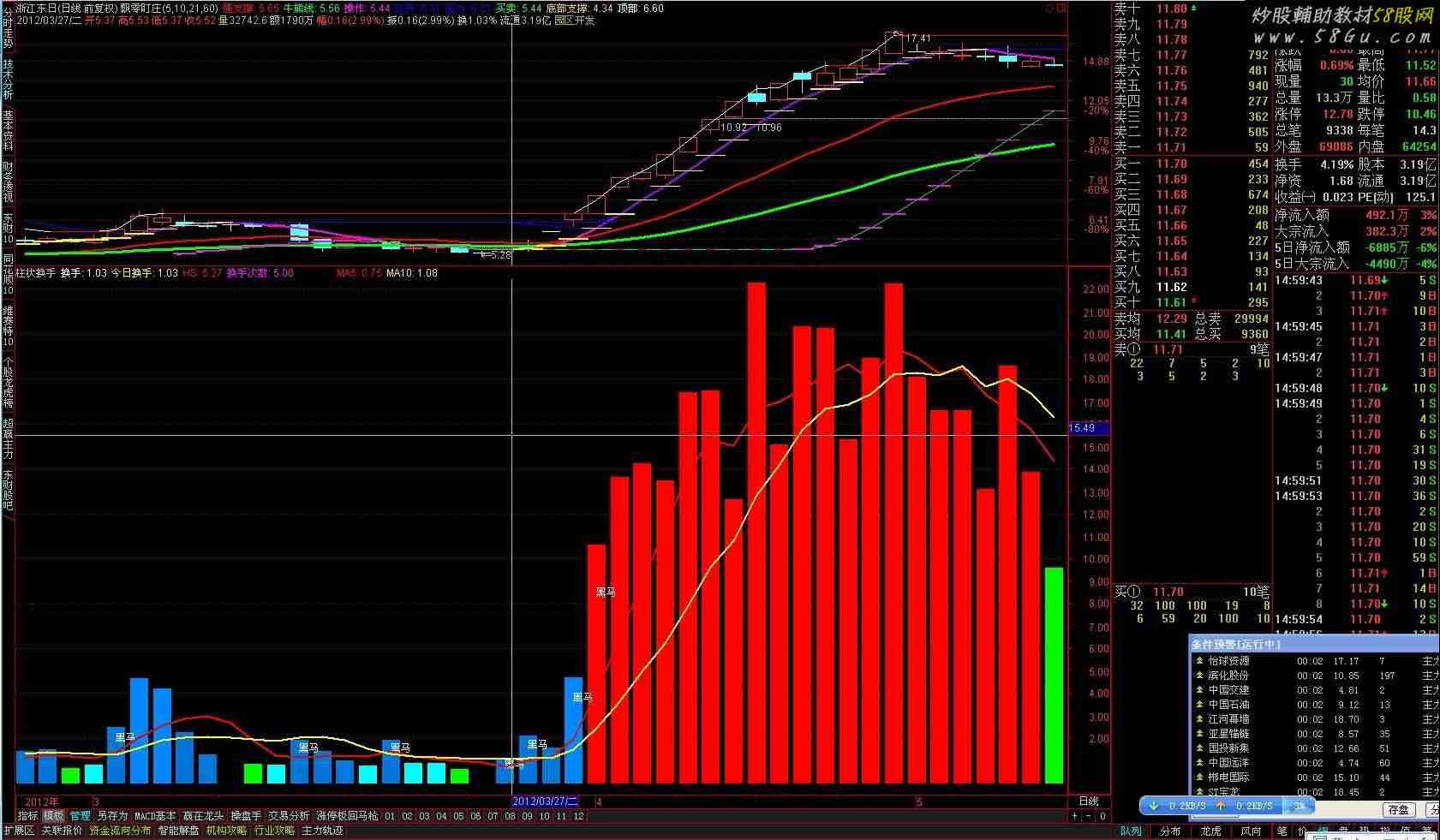 成交:=VOL,COLORFFFF00,LINETHICK0;BB:=CAPITAL;换手:成交*100/BB,LINETHICK0;今日换手:换手,LINETHICK0;HS:SUM(VOL,0)/CAPITAL,LINETHICK0;换手次数:FLOOR(HS),LINETHICK0;BBB:=IF(换手次数>0,换手次数,0);BBB2:=IF(BBB-REF(BBB,1)>0,BBB,0);距上次完全换手:=BARSLAST(BBB2),LINETHICK0,COLORGREEN;平均换手天:=FLOOR((BARSCOUNT(CLOSE)-距上次完全换手)/换手次数),COLORCYAN,LINETHICK0;A2:=成交/CAPITAL*100;A3:=A2>3 AND A2<=5;A4:=A2>5 AND A2<=7;A5:=A2>7 AND A2<=10;A6:=A2>10;{STICKLINE(A2<3 AND C>O,0,A2,6,0),COLOR555500;STICKLINE(A2<3 AND C>O,0,A2,5,0),COLOR777700;STICKLINE(A2<3 AND C>O,0,A2,4,0),COLOR999900;STICKLINE(A2<3 AND C>O,0,A2,3,0),COLORBBBB00;STICKLINE(A2<3 AND C>O,0,A2,2,0),COLORDDDD00;STICKLINE(A2<3 AND C>O,0,A2,1,0),COLORFFFF00;}STICKLINE(A2<3 AND C>O,0,A2,3,0),COLORFFFF00;{STICKLINE(A2<3 AND C<O,0,A2,6,0),COLOR005500;STICKLINE(A2<3 AND C<O,0,A2,5,0),COLOR007700;STICKLINE(A2<3 AND C<O,0,A2,4,0),COLOR009900;STICKLINE(A2<3 AND C<O,0,A2,3,0),COLOR00BB00;STICKLINE(A2<3 AND C<O,0,A2,2,0),COLOR00DD00;STICKLINE(A2<3 AND C<O,0,A2,1,0),COLOR00FF00;}STICKLINE(A2<3 AND C<O,0,A2,3,0),COLOR00FF00;{STICKLINE(A3,0,A2,6,0),COLOR553300;STICKLINE(A3,0,A2,5,0),COLOR774400;STICKLINE(A3,0,A2,4,0),COLOR995500;STICKLINE(A3,0,A2,3,0),COLORBB6600;STICKLINE(A3,0,A2,2,0),COLORDD7700;换手积极:STICKLINE(A3,0,A2,1,0),COLORFF8800;}换手积极:STICKLINE(A3,0,A2,3,0),COLORFF8800;{STICKLINE(A4,0,A2,6,0),COLOR555555;STICKLINE(A4,0,A2,5,0),COLOR777777;STICKLINE(A4,0,A2,4,0),COLOR999999;STICKLINE(A4,0,A2,3,0),COLORBBBBBB;STICKLINE(A4,0,A2,2,0),COLORDDDDDD;换手活跃:STICKLINE(A4,0,A2,1,0),COLORYELLOW;}换手活跃:STICKLINE(A4,0,A2,3,0),COLORYELLOW;{STICKLINE(A5,0,A2,6,0),COLOR550000;STICKLINE(A5,0,A2,5,0),COLOR770000;STICKLINE(A5,0,A2,4,0),COLOR990000;STICKLINE(A5,0,A2,3,0),COLORBB0000;STICKLINE(A5,0,A2,2,0),COLORDD0000;换手频繁:STICKLINE(A5,0,A2,1,0),COLORGREEN;}换手频繁:STICKLINE(A5,0,A2,3,0),COLORGREEN;{STICKLINE(A6,0,A2,6,0),COLOR000055;STICKLINE(A6,0,A2,5,0),COLOR000077;STICKLINE(A6,0,A2,4,0),COLOR000099;STICKLINE(A6,0,A2,3,0),COLOR0000BB;STICKLINE(A6,0,A2,2,0),COLOR0000DD;巨幅换手:STICKLINE(A6,0,A2,1,0),COLOR0000FF;}巨幅换手:STICKLINE(A6,0,A2,3,0),COLOR0000FF;AA:=A2>1 AND A2<=3;{STICKLINE(AA,0,A2,6,0),COLOR553300;STICKLINE(AA,0,A2,5,0),COLOR773300;STICKLINE(AA,0,A2,4,0),COLOR993300;STICKLINE(AA,0,A2,3,0),COLORBB6600;STICKLINE(AA,0,A2,2,0),COLORDD7700;}STICKLINE(AA,0,A2,3,0),COLORDD7700;BBB3:=CON2STR(REF(BBB,距上次完全换手),0);DRAWTEXT(BBB2,A2,'次换手'),COLORFFFFFF;DRAWTEXT(换手>REF(换手,1)*2,换手*0.8,'黑码'),COLORWHITE;MA5:MA(换手,5),COLORRED,LINETHICK2;MA10:MA(换手,10),COLORYELLOW,LINETHICK2;  |