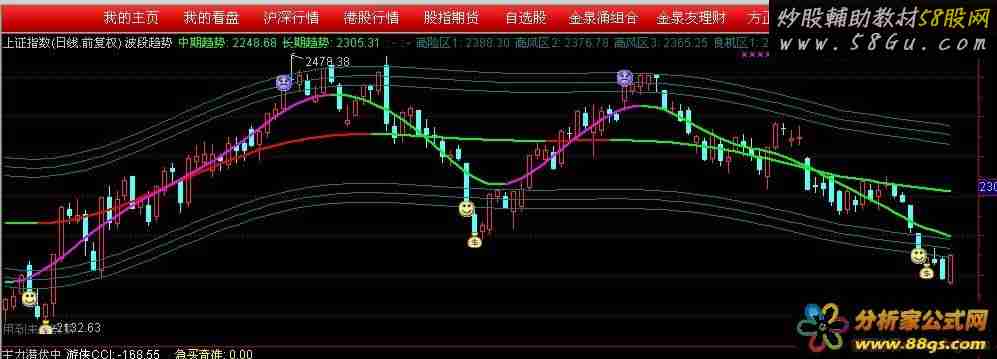 T:=(C+L+H)/3; SL:=((REF(T,1)*REF(V,1)+T*V)/(REF(V,1)+V)); VV:=SL; Y911:=IFF(CURRBARSCOUNT=1, (XMA(VV,9)*9-MA(VV,8)+MA(VV,7) -MA(VV,6)+MA(VV,5) -MA(VV,4)+MA(VV,3) -MA(VV,2) +VV)/9,XMA(VV,9)); Y912:=IFF(CURRBARSCOUNT=1, (XMA(Y911,9)*9-MA(Y911,8)+MA(Y911,7) -MA(Y911,6)+MA(Y911,5) -MA(Y911,4)+MA(Y911,3) -MA(Y911,2) +Y911)/9,XMA(Y911,9)); Y913:=IFF(CURRBARSCOUNT=1, (XMA(Y912,9)*9-MA(Y912,8)+MA(Y912,7) -MA(Y912,6)+MA(Y912,5) -MA(Y912,4)+MA(Y912,3) -MA(Y912,2) +Y912)/9,XMA(Y912,9)); 中期趋势:Y913,LINETHICK2,COLORGREEN; Y291:=IFF(CURRBARSCOUNT=1,(XMA(VV,29)*29-MA(VV,28)+MA(VV,27)-MA(VV,26)+MA(VV,25)-MA(VV,24)+MA(VV,23)-MA(VV,22)+MA(VV,21)-MA(VV,20)+MA(VV,19)-MA(VV,18)+MA(VV,17)-MA(VV,16)+MA(VV,15)-MA(VV,14)+MA(VV,13)-MA(VV,12)+MA(VV,11) -MA(VV,10)+MA(VV,9) -MA(VV,8)+MA(VV,7) -MA(VV,6)+MA(VV,5) -MA(VV,4)+MA(VV,3) -MA(VV,2)+VV)/29,XMA(VV,29)); Y292:=IFF(CURRBARSCOUNT=1,(XMA(Y291,29)*29-MA(Y291,28)+MA(Y291,27)-MA(Y291,26)+MA(Y291,25)-MA(Y291,24)+MA(Y291,23)-MA(Y291,22)+MA(Y291,21)-MA(Y291,20)+MA(Y291,19)-MA(Y291,18)+MA(Y291,17)-MA(Y291,16)+MA(Y291,15)-MA(Y291,14)+MA(Y291,13)-MA(Y291,12)+MA(Y291,11) -MA(Y291,10)+MA(Y291,9) -MA(Y291,8)+MA(Y291,7) -MA(Y291,6)+MA(Y291,5) -MA(Y291,4)+MA(Y291,3) -MA(Y291,2)+Y291)/29,XMA(Y291,29)); Y293:=IFF(CURRBARSCOUNT=1,(XMA(Y292,29)*29-MA(Y292,28)+MA(Y292,27)-MA(Y292,26)+MA(Y292,25)-MA(Y292,24)+MA(Y292,23)-MA(Y292,22)+MA(Y292,21)-MA(Y292,20)+MA(Y292,19)-MA(Y292,18)+MA(Y292,17)-MA(Y292,16)+MA(Y292,15)-MA(Y292,14)+MA(Y292,13)-MA(Y292,12)+MA(Y292,11) -MA(Y292,10)+MA(Y292,9) -MA(Y292,8)+MA(Y292,7) -MA(Y292,6)+MA(Y292,5) -MA(Y292,4)+MA(Y292,3) -MA(Y292,2)+Y292)/29,XMA(Y292,29)); 长期趋势:Y293,LINETHICK2,COLORGREEN; IF(Y293>REF(Y293,1),Y293,DRAWNULL),COLORRED,LINETHICK2; IF(Y913>REF(Y913,1),Y913,DRAWNULL),COLORMAGENTA,LINETHICK2; 高险区1:Y293*1.036,COLORLICYAN; 高风区2:Y293*1.031,COLORLICYAN; 高风区3:Y293*1.026,COLORLICYAN; 良机区1:Y293*0.974,COLORLICYAN; 良机区2:Y293*0.969,COLORLICYAN; 良机区3:Y293*0.964,COLORLICYAN; WSR1:=(CLOSE-MA(CLOSE,5))/MA(CLOSE,5)*100; WSR2:=CROSS(WSR1,5); WSR3:=CROSS(8,WSR1); WSR4:=CROSS(WSR1,-5); WSR5:=CROSS(WSR1,-8); WSR6:=WSR3; WSR7:=WSR4 OR WSR5; WSR8:=WSR7 AND FILTER(WSR7,5); WSR10:DRAWICON(WSR8,L-0.01,1); WSR9:=WSR6 AND FILTER(WSR6,5); WSR11:DRAWICON(WSR9,H+0.01,2); WSR12:=O<良机区3; DRAWICON(WSR12 AND FILTER(WSR12,12),L-0.03,9); W1:=C>REF(C,1) AND MACD<REF(MACD,1) AND MACD>0 AND V<REF(V,1); W2:=C>REF(C,1) AND MACD<0 AND MACD<REF(MACD,1) AND V<REF(V,1); XG:=W1 OR W2; VAR1:=AMOUNT/VOL/7; VAR2:=(3*HIGH+LOW+OPEN+2*CLOSE)/7; VAR3:=SUM(AMOUNT,10)/VAR1/7; VAR4:=DMA(VAR2,VOL/VAR3); VAR5:=(CLOSE-VAR4)/VAR4*100,COLORLIMAGENTA; XG1:=CROSS(VAR5,MA(VAR5,2)) AND VAR5<0 AND C<(HHV(H,5)*0.88) AND REF(O>C,1) AND REF(O>C,2); XG3:=XG AND XG1 AND L<良机区1; WSR13:=O>良机区3 AND L<良机区1 OR XG3; DRAWICON(WSR13 AND FILTER(WSR13,10),L-0.03,5); WSR14:=H>高风区3;DRAWICON(WSR14 AND FILTER(WSR14,15),H+0.03,6); WSR15:=H<高风区3 AND H>高风区2;DRAWICON(WSR15 AND FILTER(WSR15,5),H+0.03,4); WSR16:=(INDEXC-MA(INDEXC,3))/MA(INDEXC,3); WSR17:=(INDEXC-MA(INDEXC,8))/MA(INDEXC,8); WSR18:=(INDEXC-MA(INDEXC,18))/MA(INDEXC,18); WSR19:=(WSR16 + WSR17 + WSR18)/3; WSR20:=(C-MA(C,3))/MA(C,3); WSR21:=(C-MA(C,8))/MA(C,8); WSR22:=(C-MA(C,18))/MA(C,18); WSR23:=(WSR20 + WSR21 + WSR22)/3; WSR24:=(WSR19>REF(WSR19,1) AND CROSS(WSR23,WSR19))*50; WSR25:=(INDEXC-MA(INDEXC,6))/MA(INDEXC,6); WSR26:=(INDEXC-MA(INDEXC,12))/MA(INDEXC,12); WSR27:=(INDEXC-MA(INDEXC,24))/MA(INDEXC,24); WSR28:=(WSR25 + WSR26 + WSR27)/3; WSR29:=(C-MA(C,6))/MA(C,6); WSR30:=(C-MA(C,12))/MA(C,12); WSR31:=(C-MA(C,24))/MA(C,24); WSR32:=(WSR29 + WSR30 + WSR31)/3; WSR33:=(WSR28>REF(WSR28,1) AND CROSS(WSR32,WSR28))*20; WSR34:=(INDEXC-MA(INDEXC,13))/MA(INDEXC,13); WSR35:=(INDEXC-MA(INDEXC,34))/MA(INDEXC,34); WSR36:=(INDEXC-MA(INDEXC,55))/MA(INDEXC,55); WSR37:=(WSR34 + WSR35 + WSR36)/3; WSR38:=(C-MA(C,13))/MA(C,13); WSR39:=(C-MA(C,34))/MA(C,34); WSR40:=(C-MA(C,55))/MA(C,55); WSR41:=(WSR38 + WSR39 + WSR40)/3; WSR42:=(WSR37>REF(WSR37,1) AND CROSS(WSR41,WSR37)); |