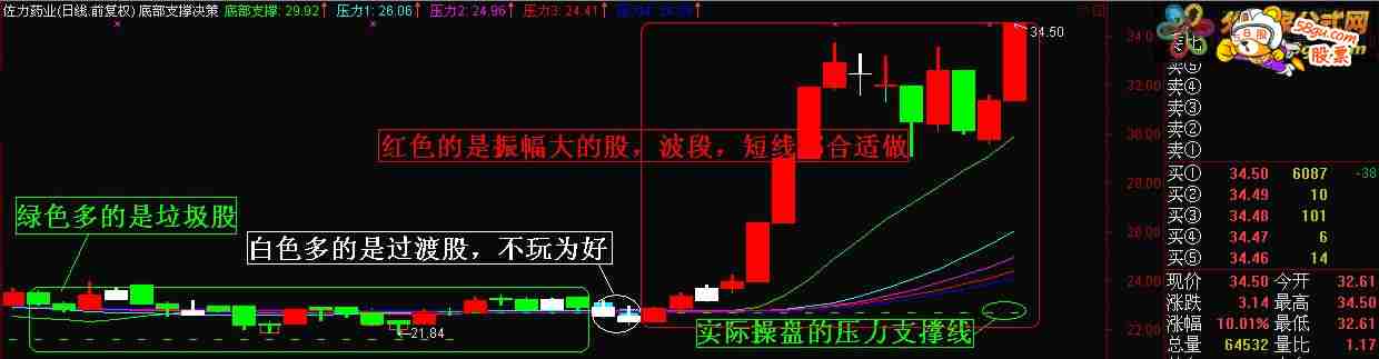 底部支撑:HHV(MA(L,11),98),COLORGREEN,LINETHICK1; 压力1:MA(底部支撑,12),COLORCYAN; 压力2:MA(底部支撑,18),COLORMAGENTA; 压力3:MA(底部支撑,24),COLORRED; 压力4:MA(底部支撑,30),COLORBLUE,LINETHICK1; JJ:=(3*C+H+L+O)/6; VAR1:=(8*JJ+7*REF(JJ,1)+6*REF(JJ,2)+5*REF(JJ,3)+4*REF(JJ,4)+3*REF(JJ,5)+2*REF(JJ,6)+REF(JJ,8))/36; TJ1:=VOL=HHV(VOL,10) AND VOL>2*REF(VOL,1) AND CLOSE>VAR1 AND C>REF(C,1); LJL:=FILTER(TJ1,5); TJ2:=IF(BARSLAST(LJL)=1 AND CLOSE>REF(HIGH,1),1,IF(BARSLAST(LJL)=2 AND CLOSE>REF(HIGH,2),1,IF(BARSLAST(LJL)=3 AND CLOSE>REF(HIGH,3),1,0))); TP:=TJ2=1; STICKLINE(CLOSE,REF(LOW,BARSLAST(LJL)),REF(LOW,BARSLAST(LJL)),1,0),COLORGREEN; STICKLINE((HIGH-REF(C,1))/REF(C,1)*100<1.1,MAX(OPEN,REF(CLOSE,1)),CLOSE,3.5,0),COLORGREEN; STICKLINE((HIGH-REF(C,1))/REF(C,1)*100<1.1,MAX(OPEN,REF(CLOSE,1)),LOW,0.001,0),COLORGREEN; STICKLINE((HIGH-REF(C,1))/REF(C,1)*100>=1.1,MIN(OPEN,REF(CLOSE,1)),CLOSE,3.5,0),COLORWHITE; STICKLINE((HIGH-REF(C,1))/REF(C,1)*100>=1.1,MIN(OPEN,REF(CLOSE,1)),HIGH,0.001,0),COLORWHITE; STICKLINE((HIGH-REF(C,1))/REF(C,1)*100>=2.1,MIN(OPEN,REF(CLOSE,1)),CLOSE,3.5,0), COLORRED; STICKLINE((HIGH-REF(C,1))/REF(C,1)*100>=2.1,MIN(OPEN,REF(CLOSE,1)),HIGH,0.001,0), COLORRED;