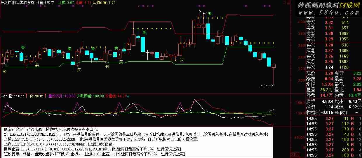 止赢止损位LC:=REF(CLOSE,1); RSI5:=((SMA(MAX((CLOSE - LC),0),5,1) / SMA(ABS((CLOSE - LC)),5,1)) * 100); TR1:=SUM(MAX(MAX((HIGH - LOW),ABS((HIGH - REF(CLOSE,1)))),ABS((LOW - REF(CLOSE,1)))),10); HA:=(HIGH - REF(HIGH,1)); LA:=(REF(LOW,1) - LOW); DMP:=SUM(IF(((HA > 0) AND (HA > LA)),HA,0),10); DMM:=SUM(IF(((LA > 0) AND (LA > HA)),LA,0),10); PDI:=((DMP * 100) / TR1); MDI:=((DMM * 100) / TR1); ADX:=MA(((ABS((MDI - PDI)) / (MDI + PDI)) * 100),5); AV:=(RSI5 + ADX); DXR:=(((ADX + REF(ADX,5)) / 2) + RSI5); WR10:=((100 * (HHV(HIGH,10) - CLOSE)) / (HHV(HIGH,10) - LLV(LOW,10))); NEWVOL:=(RSI5 - WR10); 买:=(AV + NEWVOL); 卖:=(AV - NEWVOL); DRAWTEXT(CROSS(买,卖),L*0.98,'买'),COLORYELLOW; DRAWTEXT(CROSS(卖,买),H*1.02,'卖'),COLORGREEN; MA1:=MA(CLOSE,3); MA2:=MA(CLOSE,5); X:=BARSLAST(CROSS(MA1,MA2)); 止损:REF(C,X+1)*(1-0.05),COLORGREEN; 止赢:REF(IF(C>O,C,O),X)*(1+0.1),COLORRED; 回调止赢:HHV(H,X+1)*(1-0.03),COLORYELLOW,POINTDOT,LINETHICK4; |