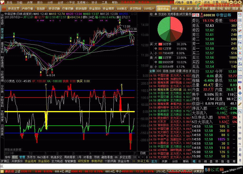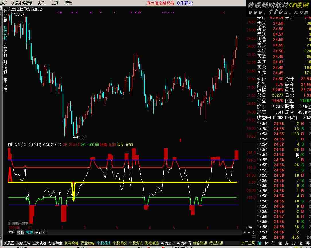 用法说明:CCI指标大家都熟悉,是做短线的利器,不用多说!指标共有五条线,最上下两条线为卖、买警戒线,中间线为强弱分界线,到风险和安全区域CCI会变色(有买卖指示,含有未来)只能做参考! TYP:=(HIGH+LOW+CLOSE)/3;CCI:(TYP-MA(TYP,14))/(0.015*AVEDEV(TYP,14));XF:IF(CCI>=100,CCI,100),COLORRED,LINETHICK2;XA:IF(CCI<=-100,CCI,-100),COLORGREEN,LINETHICK2;快卖: IF(PEAKBARS(3,15,1)=1,100,0),COLORRED,LINETHICK5;{有未来只做参考}快买: IF(TROUGHBARS(3,15,1)=0 AND HIGH>LOW+0.01,-120,0),COLORYELLOW,LINETHICK5;{有未来只做参考}STICKLINE(CCI<-150,CCI,-150,10,0),COLOR0000BB;STICKLINE(C>0,-150,-151,6,0),COLORBLUE;STICKLINE(CCI>150,CCI,150,10,0),COLOR0000BB;STICKLINE(C>0,150,151,6,0),COLORBLUE;  |