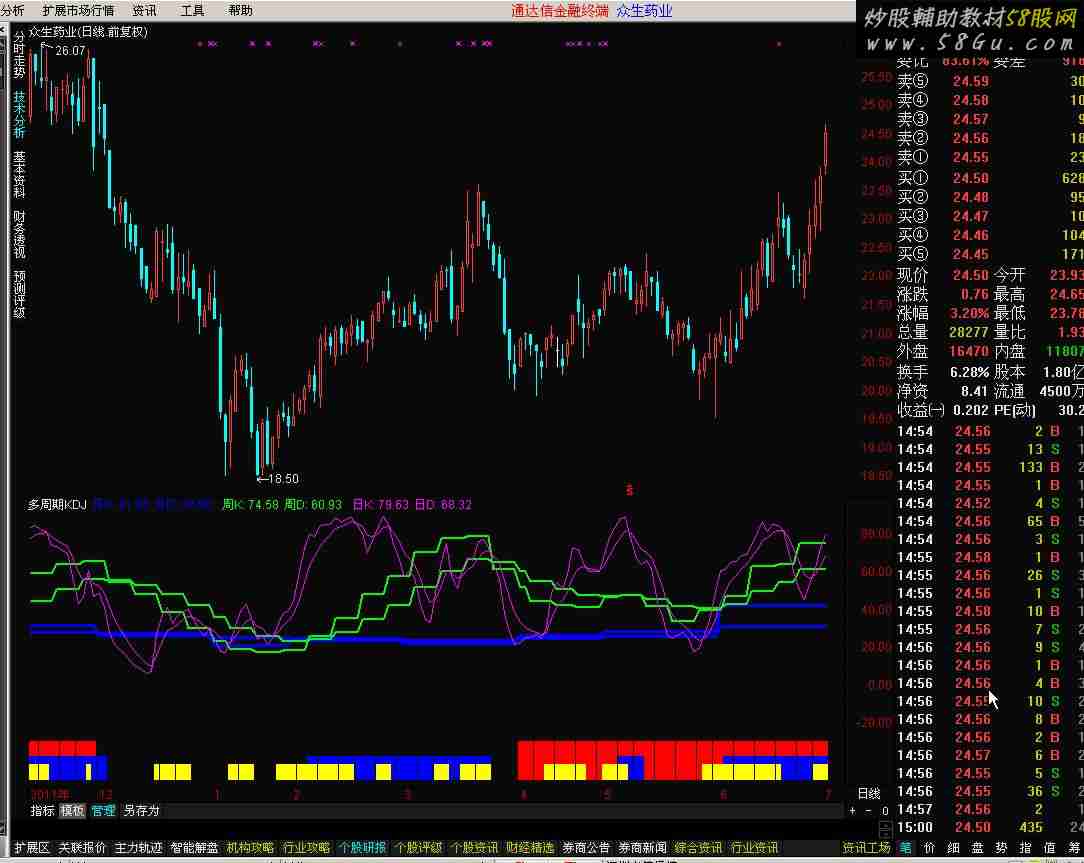 月K:KDJ.K#MONTH,LINETHICK3,COLORBLUE; 月D:KDJ.D#MONTH,LINETHICK3,COLORBLUE; Z2:=月K>月D; STICKLINE(Z2,-50,-30,2,0),LINETHICK2,COLORRED;