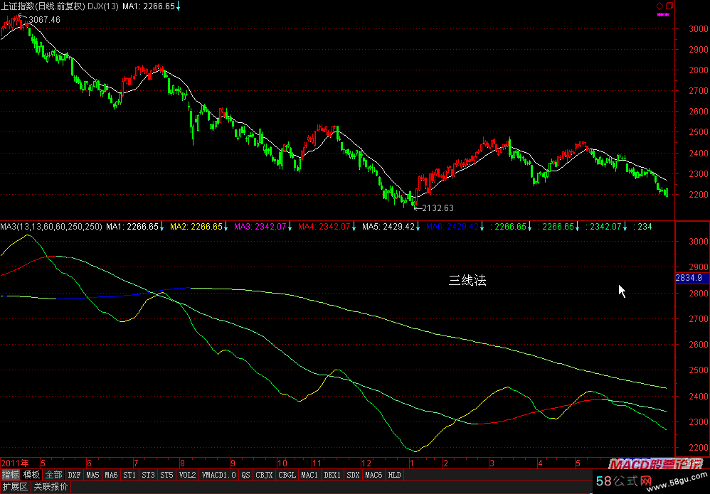 {M1,M2,M3,M4,M5,M6分别设定长短时间均线,一般是5,10,20,60,120,250 } MA1:MA(CLOSE,M1),COLORWHITE; MA2:MA(CLOSE,M2),COLORYELLOW; MA3:MA(CLOSE,M3),COLORMAGENTA; MA4:MA(CLOSE,M4),COLOR0000FF; MA5:MA(CLOSE,M5),COLORDDDDDD; MA6:MA(CLOSE,M6),COLORBLUE; IF(MA1<=REF(MA1,1),MA1,DRAWNULL),COLOR00FF00; IF(MA2<=REF(MA2,1),MA2,DRAWNULL),COLOR33FF00; IF(MA3<=REF(MA3,1),MA3,DRAWNULL),COLOR66FF00; IF(MA4<=REF(MA4,1),MA4,DRAWNULL),COLOR99FF66; IF(MA5<=REF(MA5,1),MA5,DRAWNULL),COLOR00FF33; IF(MA6<=REF(MA6,1),MA6,DRAWNULL),COLOR66FF99;