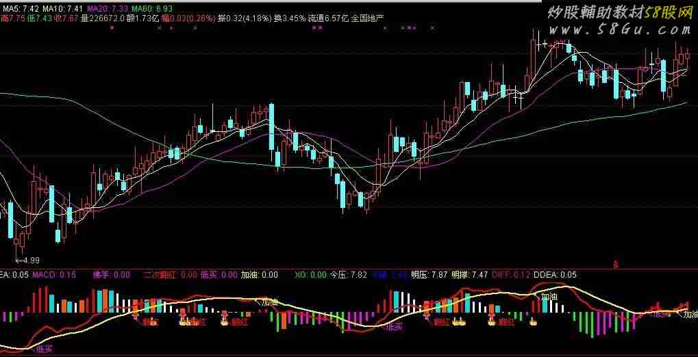 DIF:EMA(CLOSE,6)-EMA(CLOSE,19),,NODRAW; DEA:EMA(DIF,9),NODRAW; MACD:2*(DIF-DEA),COLORSTICK; STICKLINE(MACD>0,MACD,0,0.5,0),COLORRED; STICKLINE(MACD<0,MACD,0,0.5,0),COLORGREEN; STICKLINE(MACD>0 AND MACD<REF(MACD,1),MACD,0,0.5,0),COLORWHITE; STICKLINE(MACD<0 AND MACD>REF(MACD,1),MACD,0,0.5,0),COLORFF00FF; FH1:=REF(MACD,1)<REF(MACD,2) AND REF(MACD,2)<REF(MACD,3) AND REF(MACD,3)<REF(MACD,4); FH2:=MACD>=0 AND COUNT(MACD>REF(MACD,1),1)=1; FH3:=FH1 AND FH2 AND EMA(C,13)>REF(EMA(C,13),1); FH4:=FH1 AND FH2 AND ABS((DIF-DEA)/C)<0.018; FH5:=FH1 AND FH2 AND MACD<0.10; VV:=CLOSE>OPEN AND MA(CLOSE,5)>MA(CLOSE,10) AND MA(CLOSE,10)>MA(CLOSE,30) AND DIF>DEA AND MACD>REF(MACD,1) AND DIF>0 AND DEA>0 AND MA(VOL,5)>MA(VOL,34) AND MA(CLOSE,30)>=REF(MA(CLOSE,30),1); 佛手:IF(VV,1,0),NODRAW;{二次起动} X0:=BARSLAST((CROSS(MACD,REF(MACD,1)) AND MACD>0) OR CROSS(MACD,0)); X1:=BARSLAST(CROSS(0.5,COUNT(MACD>REF(MACD,1),X0+1)=X0+1));{回} X2:=COUNT(MACD<REF(MACD,1),X1+1)=X1+1 AND COUNT(MACD<0,X1+1)<=2; X3:=REF(X2,1) AND MACD>REF(MACD,1) AND C>O AND C>REF(C,1); STICKLINE(X1=0 AND MACD>0,MACD,0,2,0),COLORDCDC00;{MACD缩头} STICKLINE(X3,MACD,0,2,0),COLOR0854FF;{二次起动}; DRAWICON(佛手,-0.15,11); 二次翻红:(FH3 OR FH4 OR FH5),COLORRED,NODRAW; 低买:CROSS(DIF,DEA) AND DIF<0,COLORFF00FF,NODRAW; 加油:CROSS(DIF,DEA) AND DIF>0,COLORYELLOW,NODRAW; DRAWICON(二次翻红,-0.05,1); DRAWTEXT(二次翻红,-0.15,'↖翻红'),COLORRED; DRAWTEXT(CROSS(DIF,DEA) AND DIF<0,DEA-0.02,'↖低买'),COLORFF00FF; DRAWTEXT(CROSS(DIF,DEA) AND DIF>0,DEA-0.05,'↖加油'),COLORYELLOW; XG:二次翻红 OR 低买 OR 加油,NODRAW; YLZC:=IF(CLOSE=INDEXC,(INDEXC+INDEXH+INDEXL+INDEXO)/4,AMOUNT/(VOL+0.01)/100); 阻价:=IF(CLOSE=INDEXC,YLZC+INDEXC-INDEXL,YLZC+(CLOSE-LOW)); 支价:=IF(CLOSE=INDEXC,INDEXL+INDEXC-YLZC,LOW+(CLOSE-YLZC)); 今压:REF(阻价,1),LINETHICK0,COLORAA11BB,NODRAW; 今撑:REF(支价,1),LINETHICK0,COLOR009900,NODRAW; 明压:阻价,LINETHICK0,NODRAW; 明撑:支价,LINETHICK0,NODRAW; DIFF:DIF,COLORRED,LINETHICK2; DDEA:DEA,COLORYELLOW,LINETHICK2; |