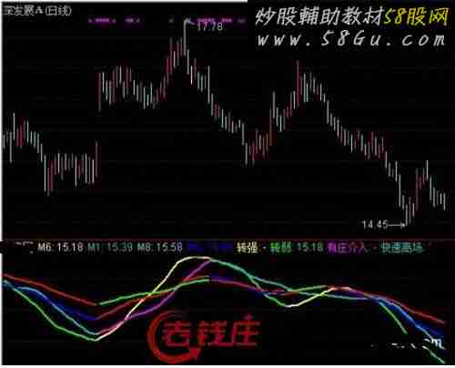 M6:MA(CLOSE,24),LINETHICK2,COLORYELLOW; M1:MA(CLOSE,34),LINETHICK2,COLORLIGREEN; M8:EMA(C,55),COLORFFCC66; MS:EMA(C,89),COLORBLUE; 转强:IF(M6>=REF(M6,1),M6,DRAWNULL),COLORYELLOW,LINETHICK2.5; 转弱:IF(M6<REF(M6,1),M6,DRAWNULL),COLORGREEN,LINETHICK2.5; 有庄介入:IF(M1>=REF(M1,1),M1,DRAWNULL),COLORMAGENTA,LINETHICK2.5; 快速离场:IF(M1<REF(M1,1),M1,DRAWNULL),COLORLIBLUE,LINETHICK2.5; 转强2:IF(M8>=REF(M8,1),M8,DRAWNULL),COLORRED,LINETHICK2.5; 转弱2:IF(M8<REF(M8,1),M8,DRAWNULL),COLORBLUE,LINETHICK2.5; 转强3:IF(MS>=REF(MS,1),MS,DRAWNULL),COLORGREEN,LINETHICK2.5; 转弱3:IF(MS<REF(MS,1),MS,DRAWNULL),COLORRED,LINETHICK2.5;
