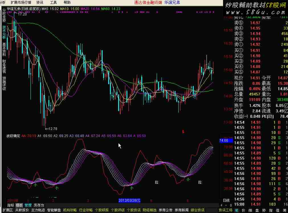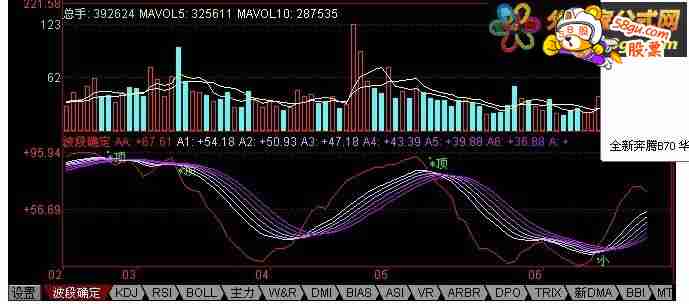 q1:=(CLOSE-REF(CLOSE, 1))/REF(CLOSE, 1)*100; q2:=(CLOSE-LLV(LOW, 18))/(HHV(HIGH, 18)-LLV(LOW, 18))*100; q3:=SMA(q2, 9, 1); q4:=SMA(q3, 3, 1); aa:3*q3-2*q4, ,color1010FF; q5:=aa>1*REF(aa, 1); q6:=LLVBARS(LOW, 50); q7:=SUM(VOL, q6); q8:=HHVBARS(HIGH, 50); q9:=SUM(VOL, q8); q10:=(CLOSE-REF(OPEN, q8))/REF(OPEN, q8)*100; q11:=HHV(aa,5); A1:EMA(q3, 3) , COLORFFDDCC; A2:EMA(a1, 3) , COLORFFBBCC; A3:EMA(a2, 3) , COLORFF99CC; A4:EMA(a3, 3) , COLORFF55CC; A5:EMA(a4, 3) , COLORFF33CC; A6:EMA(a5, 3) , COLORFF11CC; a:EMA(a4, 3), , COLORFF00CC; DRAWTEXT(CROSS(aa, 20) AND q10<-13,10,'*大底'), color00ff00; DRAWTEXT(CROSS(aa, a5) AND REF(aa,1)<34,REF(aa,1),'小'), color00ff00; DRAWTEXT(CROSS(A1, aa) AND REF(aa,1)>80, REF(aa,3), '*顶'), COLOR00ff00; DRAWTEXT(CROSS(aa, A1) AND q5 AND a1<20 AND q1>9 OR a1>1*REF(a1, 1) AND q1>4 AND a1<60, 30, '拉'), COLORFFFFCC;  |
