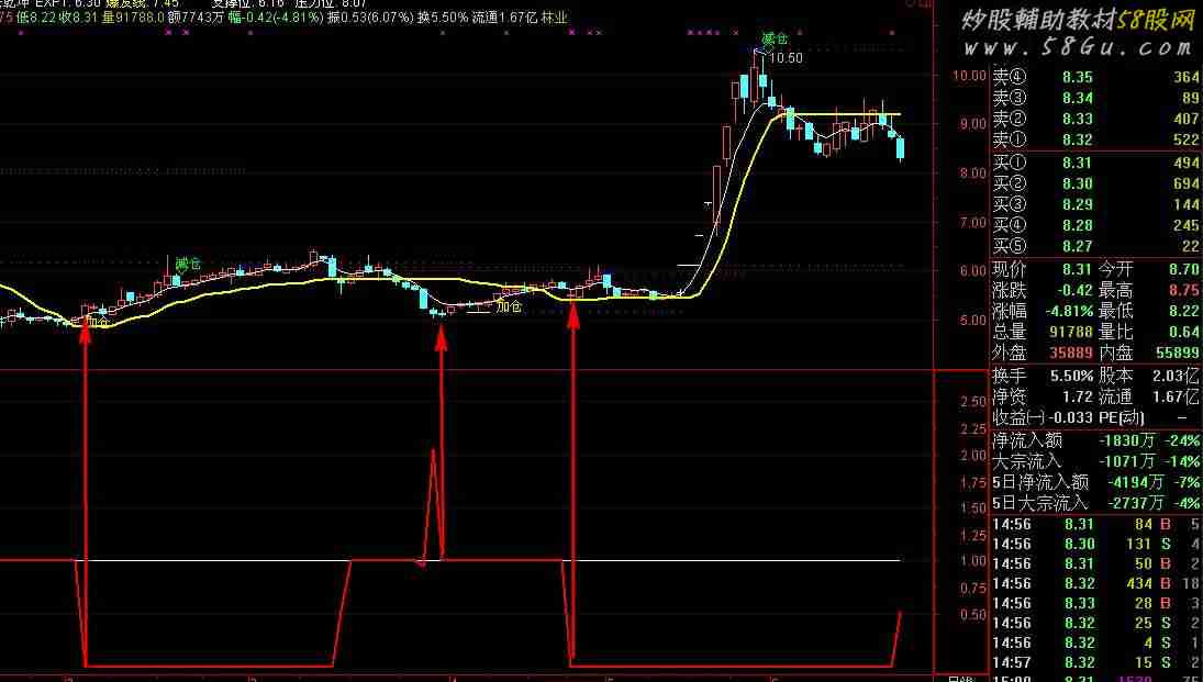 秒杀庄1,COLORWHITE; VAR2:=REF(LOW,1); VAR3:=SMA(ABS(LOW-VAR2),3,1)/SMA(MAX(LOW-VAR2,0),3,1)*100; VAR4:=EMA(IF(CLOSE*1.3,VAR3*10,VAR3/10),3); VAR5:=LLV(LOW,13); VAR6:=HHV(VAR4,13); VAR7:=IF(MA(CLOSE,34),1,0); VAR8:=EMA(IF(LOW<=VAR5,(VAR4+VAR6*2)/2,0),3)/6800*VAR7; VAR9:=IF(VAR8>100,100,VAR8); 吸筹:=VAR9; A:=SUM(吸筹,1); B:=HHV(A,2); IF(A>=B,A,A<B),LINETHICK2,COLORRED; |
