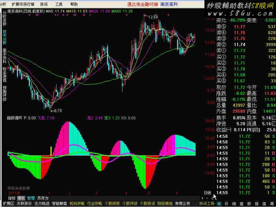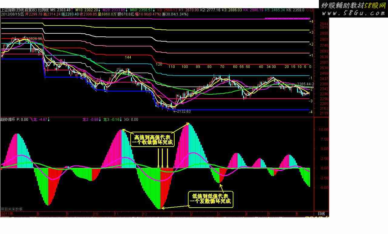 2:指标原理以多条均线粘合强度的一张一弛,一收敛一发散成一个圆为依据来捕捉趋势的循环变化;