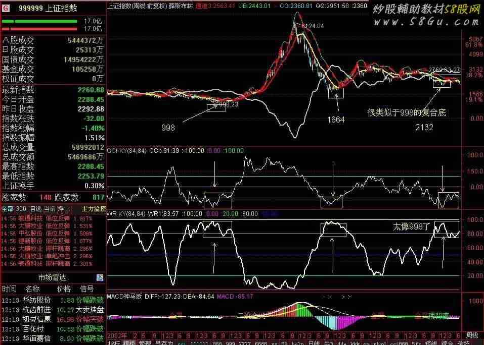 不管你信不信,反正我信了 大盘顶底区域准确判断指标组合 源码 附图主图AA:=MA((2*CLOSE+HIGH+LOW)/4,5); 通道1:=AA*102/100; 通道2:=AA*(200-102)/100; CC:=ABS((2*CLOSE+HIGH+LOW)/4-MA(CLOSE,20))/MA(CLOSE,20); DD:=DMA(CLOSE,CC); 通道3:(1+7/100)*DD,COLORRED; 通道4:=(1-7/100)*DD; MID:=MA(C,12); VART1:=POW((C-MID),2); VART2:=MA(VART1,12); VART3:=SQRT(VART2); UPPER:=MID+2*VART3; LOWER:=MID-2*VART3; BOLL:=REF(MID,1),COLORFFFFFF; UB:REF(UPPER,1),COLORGREEN; LB:=REF(LOWER,1),COLORFF00FF; BB:=V>MA(V,5) ; DD1:=V<MA(V,5); IF(BB,UB,DRAWNULL),COLORRED,LINETHICK3; FL:=MA(CLOSE,17)+ABS(MA(CLOSE,17)-REF(MA(CLOSE,17),1)),COLORF4E202; FS:=MA(CLOSE,17)+MA(CLOSE,17)-REF(MA(CLOSE,17),1),COLORF4E202; CG:IF(MA(CLOSE,17)<FS,FS,MA(CLOSE,17)),COLORF4E202; 年线:=EMA(C,250); A:=CG-(EMA(C,3)-CG),COLORFFCCCC; QQ:EMA((年线-(EMA(C,3)-年线)),5),LINETHICK2; IF(CG=FS,CG,CG), COLORYELLOW,LINETHICK2; IF(C>CG,CG,DRAWNULL), COLORRED,LINETHICK2;附图1(参数N 1 120 84) TYP:=(HIGH+LOW+CLOSE)/3; CCI:(TYP-MA(TYP,N))/(0.015*AVEDEV(TYP,N)); -100;0;100;附图2(参数N 1 120 84) WR1:EMA(100*(HHV(HIGH,N)-CLOSE)/(HHV(HIGH,N)-LLV(LOW,N)),5),LINETHICK2; 100;0;20;80;50;