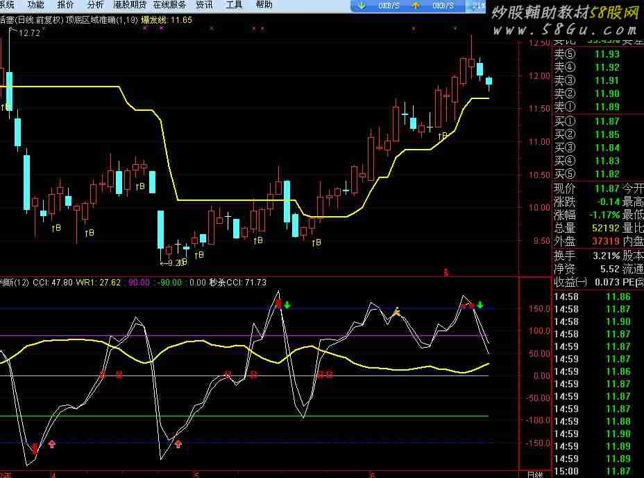 使用说明: 1、底部出现红柱不立即介入,待出现红箭头时再买进; 2、出现B点,开始转强,可适当加仓; 3、出现快走信号时,表示1-3天内股价见顶,如顶部红柱+快走信号,或者顶部红柱+绿箭头要减仓止损; 4、一般CCI上穿WR,并且CCI在WR上方运行,表示该支股票为强势股。 5、设定参数N(1,100,12),同学们也可根据需要自行设定。TYP:=(HIGH+LOW+CLOSE)/3; CCI:(TYP-MA(TYP,N))/(0.015*AVEDEV(TYP,N)); WR1:EMA(100*(HHV(HIGH,N)-CLOSE)/(HHV(HIGH,N)-LLV(LOW,N)),5),LINETHICK2; 90; -90; 0; {秒杀CCI} 秒杀CCI:EMA((TYP-MA(TYP,N))/(0.015*AVEDEV(TYP,N)),2.0332),COLORWHITE; STICKLINE(秒杀CCI<-150,秒杀CCI,-150,2,0),COLOR0000BB; STICKLINE(C>0,-150,-151,2,0),COLORBLUE; STICKLINE(秒杀CCI>150,秒杀CCI,150,2,0),COLOR0000BB; STICKLINE(C>0,150,151,6,0),COLORBLUE; DRAWICON(CROSS(CCI,0) OR CROSS(秒杀CCI,WR1),0,7); DRAWICON(CROSS(CCI,秒杀CCI) AND 秒杀CCI>100 ,秒杀CCI,15); DRAWICON(CROSS(CCI,-130) ,-153,1); DRAWICON(CROSS(153,秒杀CCI),153,2); |