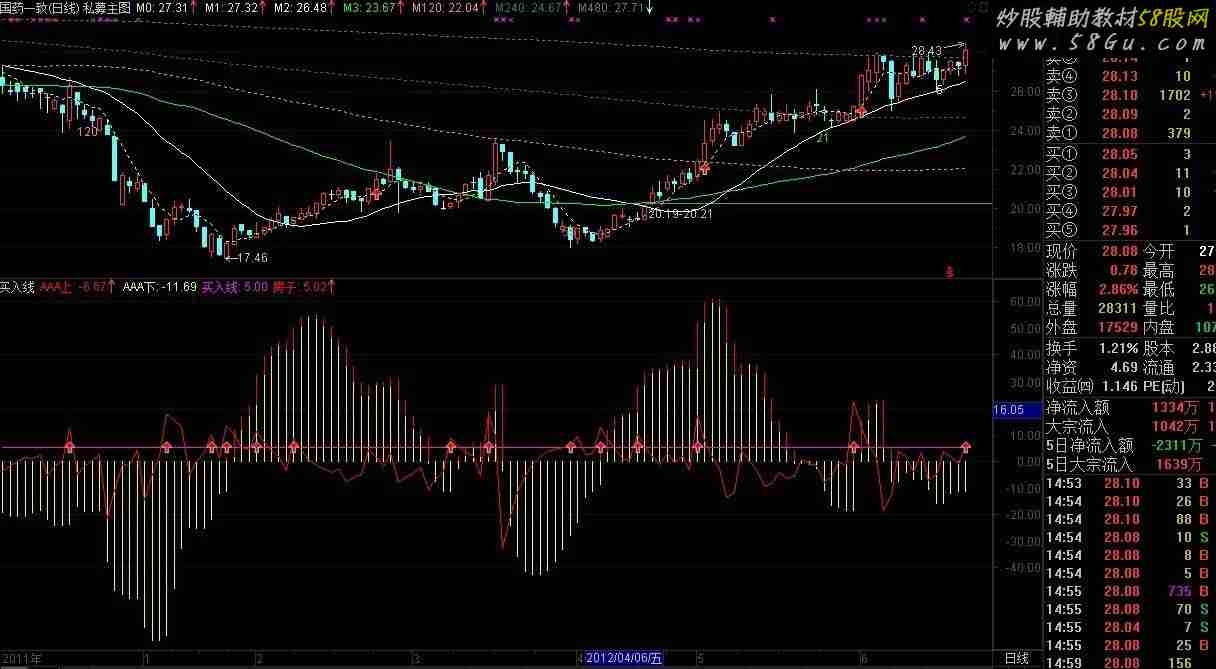 DIF1:=EMA(DCLOSE,12)-EMA(DCLOSE,26); DEA1:=EMA(DIF1,9); {柱状线} AAA1:=(DIF1-DEA1)*2*60; AAA上:IF(AAA1>REF(AAA1,1),AAA1,REF(AAA1,1)), STICK,COLORRED,LINETHICK1; AAA下:IF(AAA1<REF(AAA1,1),AAA1,REF(AAA1,1)),STICK,COLORYELLOW,LINETHICK1; 买入线:5; 房子:AAA1-REF(AAA1,1),COLORRED; DRAWICON(CROSS(房子,买入线),买入线,1);