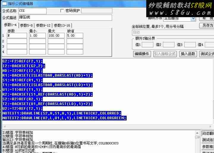 在K线上运用趋势线预警的方法到目前为止,通达信只提供在分时图中画线预警,K线上不能直接画趋势线预警,有没有办法变通一下呢?这正是本贴之目的。 首先我们已知了在K线上画趋势线的指标“CYX—撑压线”(系统公式),如图1; 该公式不能直接警,需要修改一下,系统公式直接修改,在第二次启动时会自动删除修改部分,所以,需要将公式另存为:画线预警主图(公式名称自定),然后打开自己看好的个股K线图,键入公式名称:HXYJ(画线预警主图),调出新的主图公式,如图2;下面对公式进行编辑修改,很简旦,在公式未尾添加: DRAWTEXT(CROSS(C,NOTEXT1*1.00),NOTEXT1*1.001,'↙冲关');“确定”! 回到K线图,根据情况,调整公式参数N,股价越过趋势线,“冲关”的提示会自动出现,如图3所示。 如果某日盘中突破了趋势线,收盘价却低于趋势线,“冲关”的提示会消失,所以,要以收盘价为准。 主图出来了,要想获得自动预警,只要将该主图指标转换成条件选股指标即可,送佛送西,预警指标如下:
