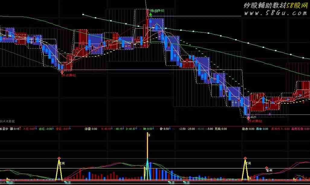 额:AMOUNT/100000000,,COLORFFFFFF,NODRAW; VAR100:=AMOUNT/((HIGH-LOW)*2-ABS(CLOSE-OPEN)); 入亿:IF(CLOSE>OPEN,VAR100*(HIGH-LOW),IF(CLOSE<OPEN,VAR100*((HIGH-OPEN) +(CLOSE-LOW)),AMOUNT/2))/100000000,COLORRED,NODRAW; 出亿:IF(CLOSE>OPEN,0-VAR100*((HIGH-CLOSE)+(OPEN-LOW)), IF(CLOSE<OPEN,0-VAR100*(HIGH-LOW),0-AMOUNT/2))/100000000,COLOR00FF00,NODRAW; 差亿:入亿+出亿,COLORRED,NODRAW;量:=V/CONST(HHV(V,90))*30,COLORRED; {粉色} STICKLINE(CLOSE>=OPEN,0,量*1,2.4,0),COLOR000033; STICKLINE(CLOSE>=OPEN,0,量*1,1.6,0),COLOR000055; STICKLINE(CLOSE>=OPEN,0,量*1,0.8,0),COLOR000077; STICKLINE(CLOSE>=OPEN,0,量*1,0.0,0),COLOR0000DD; {蓝色} STICKLINE(CLOSE<=OPEN,0,量*1,2.4,0),COLOREC0000; STICKLINE(CLOSE<=OPEN,0,量*1,1.6,0),COLORFF4600; STICKLINE(CLOSE<=OPEN,0,量*1,0.8,0),COLORFF6300; STICKLINE(CLOSE<=OPEN,0,量*1,0,0),COLORFF8B00; {倍量} 倍量:(量/REF(量,1)>=1.91 AND COUNT(C>O,1)) OR (L>REF(H,1) AND COUNT(O>C,1) AND 量/REF(量,1)>=1.91),NODRAW,COLORYELLOW; STICKLINE(倍量,0,量,0.0001,0),COLOR00FFFF; DRAWTEXT(倍量,量*0.99,'倍'),COLORYELLOW,LINETHICK1; {資金线} VAR88:=LLV(LOW,21); VAR99:=HHV(HIGH,21); K:EMA((CLOSE-VAR88)/(VAR99-VAR88)*50,6),COLORRED,LINETHICK1;{红} IF(K<= REF(K,1),K,DRAWNULL),COLORGREEN,LINETHICK1;{绿} D:EMA(0.667*REF(K,1)+0.333*K,2),COLORGREEN,LINETHICK1;{绿} IF(D>= REF(D,1),D,DRAWNULL),COLORMAGENTA,LINETHICK1;{洋红} {DRAWICON(LONGCROSS(D,K,0.1),D,2),COLORRED,LINETHICK1; DRAWICON(LONGCROSS(K,D,0.1),K,1),COLORGREEN,LINETHICK1;} {绝顶公式} VAR11:=(HHV(HIGH,8)-CLOSE)/(HHV(HIGH,8)-LLV(LOW,8))*100-70; VAR22:=SMA(VAR11,8,1)+100; VAR33:=(CLOSE-LLV(LOW,8))/(HHV(HIGH,8)-LLV(LOW,8))*100; VAR44:=SMA(VAR33,3,1); VAR55:=SMA(VAR44,3,1)+100; VAR66:=VAR55-VAR22; 绿:IF(VAR66>100,VAR66-100,0),COLORGREEN,LINETHICK1;{绿,量减} IF(绿>=REF(绿,1),绿,DRAWNULL),COLORRED,LINETHICK1; {红:IF(REF(绿,1)<=绿,绿,REF(绿,1)),COLORRED,LINETHICK0;{红} {IF(红<=REF(红,1),红,DRAWNULL),COLORCYAN,LINETHICK0;{青} 青:IF(REF(绿,1)>绿,绿,REF(绿,1)),COLORCYAN,LINETHICK0;{青}; IF(青>=REF(青,1),青,DRAWNULL),COLORMAGENTA,LINETHICK1;{洋红,量增} {地量买点} STICKLINE(CROSS(0.9,1/VOL*1000>0.01 AND "KDJ.J"<0),量<0,-3,1.2,0),COLORCYAN,LINETHICK1; DRAWTEXT(CROSS(0.9,1/VOL*1000>0.01 AND "KDJ.J"<0),(量<0-3),'地量'),COLORCYAN,LINETHICK1; 2.5,COLOR00FFFF,LINETHICK1; 25,COLOR00FFFF,LINETHICK1; 45,COLORLICYAN,LINETHICK1; -5,COLORWHITE;VAR1:=SMA(MAX(CLOSE-REF(CLOSE,1),0),34,1)/SMA(ABS(CLOSE-REF(CLOSE,1)),7,1)*100; VAR2:=SMA(MAX(CLOSE-REF(CLOSE,1),0),13,1)/SMA(ABS(CLOSE-REF(CLOSE,1)),13,1)*100; VAR3:=BARSCOUNT(CLOSE); VAR4:=VAR1<20 AND VAR2<23 AND VAR3>35; VAR5:=VAR4 AND COUNT(VAR4,1)=1; VAR6:=EMA(CLOSE,21)-EMA(CLOSE,8); VAR7:=EMA(VAR6,5); VAR8:=TROUGHBARS(3,6,1)<4 AND CROSS(VAR6,VAR7); VAR9:=(HIGH+LOW+CLOSE)/3; VAR10:=IF(TROUGHBARS(3,16,1)=0 AND HIGH>LOW+0.04,45,0); VAR110:=(VAR9-MA(VAR9,14))/(0.015*AVEDEV(VAR9,14)); 见底: VAR10,COLORYELLOW,LINETHICK3; DRAWTEXT(VAR110<-110 AND 见底>0,40,'见底'), ,COLORYELLOW; DRAWTEXT(见底 AND VAR11<-100 AND VAR8 AND VAR5>0,4.1,'★组合5分钟线选股思路获利5%以上'), , COLORRED; DRAWICON(见底>0,45,1); XX:=EMA(CLOSE,30)-EMA(CLOSE,17); AA:=EMA(XX,5); YY:=EMA(XX,13); 短:=TROUGHBARS(3,10,1)<1 AND CROSS(XX,AA); DRAWICON(短>0,1.8,18); DRAWTEXT(短>0,1.8,'慧眼'),COLORWHITE; 枪:=TROUGHBARS(3,5,1)<1 AND XX<YY; 短1:=IF(枪>0,25,0),STICK,COLORF0F000,LINETHICK4; DRAWICON(短1>0,25,1 ); DRAWTEXT(短1>0,25,'套利'),COLORWHITE; 短2:=CROSS(XX,AA) AND TROUGHBARS(3,7,1)<1; DRAWICON(短2>0,1.4,1 ); DRAWTEXT(短2,2.5,'小牛'),COLORWHITE; 狙击:短 OR 短1 OR 短2,COLORYELLOW,LINESTICK,LINETHICK2; VAR12:=PEAKBARS(3,15,1)<10; VAR13:=IF(VAR12=1,2,0); 顶:= IF(VAR13=2,2,0); 逃命:IF(顶>REF(顶,1),45,0),COLORCYAN,LINESTICK,LINETHICK2; DRAWTEXT(逃命=3,40,'逃命'),COLORWHITE; RSV:= (CLOSE-LLV(LOW,9))/(HHV(HIGH,9)-LLV(LOW,9))*5; FASTK:=SMA(RSV,3,1); {金:SMA(FASTK,3,1),COLORLIGREEN,COLORYELLOW; 阴阳:SMA(金,5,1),COLORLICYAN,COLORMAGENTA;} VAR14:=TROUGHBARS(3,15,1)<10; VAR15:=IF(VAR14=1,50,0); 底部:=IF(VAR15=50,35,0); 机构介入:底部/60,0,LINETHICK2,LINESTICK,COLORRED; VAR16:=EMA(EMA(CLOSE,13),13); 控盘:= (VAR16-REF(VAR16,1))/REF(VAR16,1)*1000,COLORFFCCCC,POINTDOT; 无庄控盘:=控盘<0,LINESTICK; 有庄控盘:=控盘>REF(控盘,1) AND 控盘>0,COLORMAGENTA,LINETHICK2,LINESTICK; VAR17:=100*WINNER(CLOSE*0.95); 主力出货:=控盘<REF(控盘,1) AND 控盘>0,COLORGREEN,LINESTICK; 高度控盘:VAR17>50 AND COST(85)<CLOSE AND 控盘>0,COLORLIMAGENTA,LINESTICK;