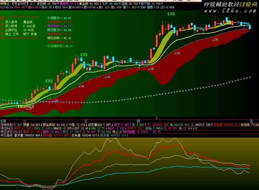 差价:=(C-O)*0.382; 均价:=(C+差价); 买入:=IF(C<均价,V*差价,V); 卖出:=IF(C>均价,V*差价,V); 量差:=买入-卖出; 基本量:ema(eMA(买入,17)-EMA(量差,246)/246,2),COLORWHITE; 启动量:ema(eMA(买入,34)-EMA(量差,246)/246,2),COLORRED,LINETHICK2; 生命量:ema(eMA(买入,68)-EMA(量差,246)/246,2),COLORYELLOW; 做多量:EMA(eMA(买入,136)-EMA(量差,246)/246,2),COLORAAAA00,LINETHICK2;