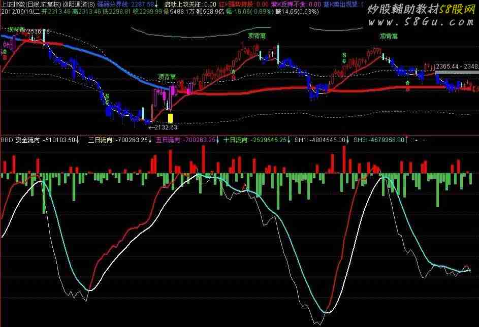BBD 超B:=L2_AMO(0,2)/10000.0; 大B:=L2_AMO(1,2)/10000.0; 中B:=L2_AMO(2,2)/10000.0; 小B:=L2_AMO(3,2)/10000.0; 超S:=L2_AMO(0,3)/10000.0; 大S:=L2_AMO(1,3)/10000.0; 中S:=L2_AMO(2,3)/10000.0; 小S:=L2_AMO(3,3)/10000.0; 资金流向:(超B+大B+中B+小B)-(超S+大S+中S+小S),NODRAW; STICKLINE(资金流向>0,0,资金流向,2,0),COLORRED; STICKLINE(资金流向<0,0,资金流向,2,0),COLORLIGREEN; 三日流向:SUM(资金流向,5),NODRAW; 五日流向:SUM(资金流向,5),NODRAW; 十日流向:SUM(资金流向,10),NODRAW; SH:=SUM(资金流向,15),COLOR0000FF; SH1:SMA(SH,3,1); SH2:=SMA(SH1,3,1); SH3:SMA(SH2,3,1),LINETHICK2,COLORCYAN; IF(SH3<SH1,SH3,DRAWNULL),COLORWHITE,LINETHICK2; IF(SH1>SH3,SH1,DRAWNULL),COLORRED,LINETHICK2; |