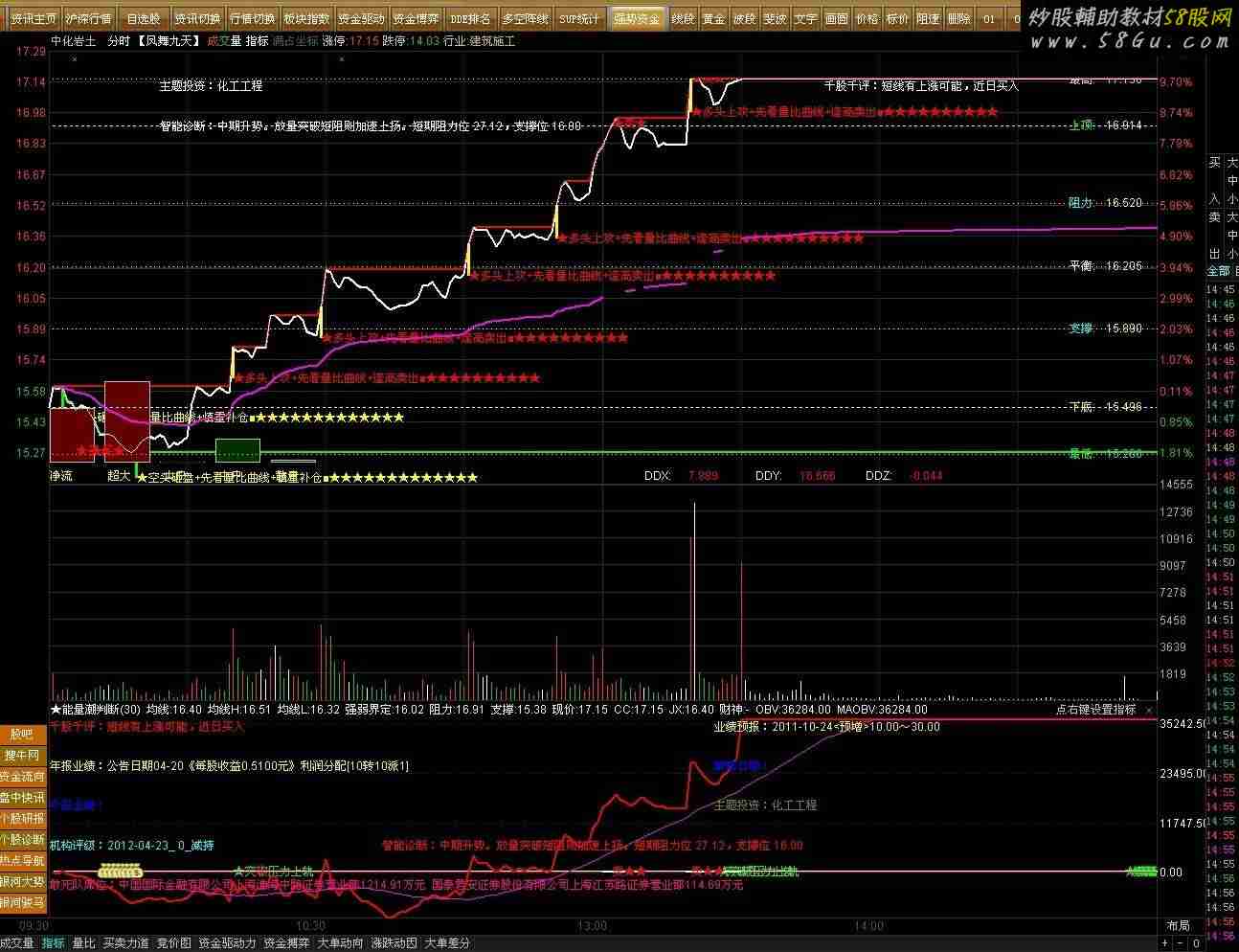 【凤舞九天】分时附图----新编能量潮均线:IF(BETWEEN(C/(SUM(AMOUNT,0)/SUM(VOL*100,0)), 1.05,0.95)=0,MA(C,0),(SUM(AMOUNT,0)/SUM(VOL*100,0))),COLORYELLOW; 均线H:(均线*1.007 ),COLORGREEN ,LINETHICK9; 均线L:(均线/1.005 ),COLORGREEN ,LINETHICK9; 均线横盘:=C<均线H AND C>均线L; STICKLINE(均线横盘,均线L,均线,3,0),COLORYELLOW; 放量:=SUM(VOL,6)>REF(MA(VOL,30),1)*10; 横盘:=((HHV(CLOSE,BARSCOUNT(CLOSE))-LLV(CLOSE,BARSCOUNT(CLOSE)))/CLOSE)<1; 横涨:=横盘 AND 放量 AND (C>均线H); 横跌:=横盘 AND 放量 AND CROSS(均线L,C) ; 突破:=FILTER(横涨,100); 下破:=FILTER(横跌,50); DRAWTEXT(突破,均线H,'★突破压力上轨'),COLORGREEN; MA30:=EMA(CLOSE,30); 强弱界定:EMA(CLOSE,900); STICKLINE((MA30>强弱界定),MA30,强弱界定,2,0),COLOR0000FF; STICKLINE((MA30<强弱界定),MA30,强弱界定,2,0),COLOR00FF00; DRAWICON(CROSS(MA30,强弱界定),H,7); H1:=MAX(DYNAINFO(3),DYNAINFO(5)); L1:=MIN(DYNAINFO(3),DYNAINFO(6)); P1:=H1-L1; 阻力:L1+P1*7/8,COLORYELLOW ,LINETHICK8; 支撑:L1+P1*0.5/8,COLORYELLOW,LINETHICK8; 现价:CLOSE,COLORWHITE,LINETHICK3;CC:CLOSE,COLORWHITE,LINETHICK2; STICKLINE(突破>0,支撑,阻力,1,0),COLORRED ,LINETHICK9; JX:IF(BETWEEN(C/(SUM(AMOUNT,0)/SUM(VOL*100,0)), 1.05,0.95)=0,MA(C,0),(SUM(AMOUNT,0)/SUM(VOL*100,0))),COLORRED;STICKLINE(CROSS(支撑,现价),支撑,阻力,1,0),COLORYELLOW; DRAWTEXT(LONGCROSS(支撑,现价,2),支撑 *1.001,'买★★'),COLORYELLOW;{吸} DRAWTEXT(LONGCROSS(现价,阻力,2),现价,'卖★★'),COLORRED; A1:=((C-LLV(L,21))/(HHV(H,21)-LLV(L,21)))*100; A2:=(MA(3*SMA(A1,6,1)-2*SMA(SMA(A1,5,1),5,1),2)); A3:=(C-LLV(LOW,34))/(HHV(HIGH,34)-LLV(LOW,34))*100; A4:=SMA(SMA(A3,3,1),3,1); A5:=3*SMA(A3,3,1)-2*A4; A6:=EMA(A5,5); A7:=EMA(100*(C-LLV(LOW,34))/(HHV(H,34)-LLV(LOW,34)),3); A8:=((3*SMA((((C-LLV(LOW,20))/(HHV(HIGH,20)-LLV(LOW,20)))*100),5,1))-(2*SMA(SMA((((C-LLV(LOW,20))/(HHV(HIGH,20)-LLV(LOW,20)))*100),5,1),3,1))); 财神爷:=A2<3 AND A6<3 AND A7<8.5 AND A8<5; STICKLINE(财神爷,58,55,14,0),COLOR00CCCC; STICKLINE(财神爷,57,56,12,0),COLOR009999; STICKLINE(财神爷,45,48,4,0),COLOR0077AA; STICKLINE(财神爷,54,50,10,0),COLOR0088DD; STICKLINE(财神爷,55,48,6,0),COLOR00AAFF; STICKLINE(财神爷,53,52,4,0),COLOR000000; STICKLINE(财神爷,53,50,1,0),COLOR0077EE; STICKLINE(财神爷,60,55,7,0),COLOR8800CC; STICKLINE(财神爷,60,63,4,0),COLOR7700AA; 财神:IF(财神爷,58,DRAWNULL),LINETHICK4,POINTDOT,COLORYELLOW; STICKLINE(财神爷,26,20,12,0),COLORFFFFFF; STICKLINE(财神爷,33,25,14,0),COLOR8800CC; STICKLINE(财神爷,46,32,16,0),COLORAA00DD; STICKLINE(财神爷,37,34,8,0),COLOR00AAFF; STICKLINE(财神爷,50,44,2,0),COLOR000000; STICKLINE(财神爷,49,49,1,0),COLOR0000EE; DRAWICON(财神爷,39,9);上线:=SMA(C,6.5,1); 下线:=SMA(C,13.5,1); 上线界:=SMA(C,3,1); 下线界:=SMA(C,8,1); STICKLINE(上线>下线 , 上线,下线 ,2.5, 0),COLORRED,LINETHICK2; STICKLINE(下线>上线,上线,下线,2.5,0),COLORBLUE,LINETHICK2;VA:=IF(CLOSE>REF(CLOSE,1),VOL,-VOL); OBV:SUM(IF(CLOSE=REF(CLOSE,1),0,VA),0),COLORRED ,LINETHICK9; MAOBV:MA(OBV,M);DRAWTEXT_FIX(1,0.0,0.4,0,STRCAT('中报业绩:',EXTERNSTR(0,9))),COLORBLUE; DRAWTEXT_FIX(1,0.0,0.2,0,STRCAT('年报业绩:',EXTERNSTR(0,8))),COLORYELLOW; DRAWTEXT_FIX(1,0.6,0,0,STRCAT('业绩预报:',EXTERNSTR(0,14))),COLORYELLOW;DRAWTEXT_FIX(1,0.0,0.6,0,STRCAT('机构评级:',EXTERNSTR(0,11))),COLORCYAN;DRAWTEXT_FIX(1,0.6,0.2,0,STRCAT('解禁日期:',EXTERNSTR(0,15))),COLORBLUE; DRAWTEXT_FIX(1,0.6,0.4,0,STRCAT('主题投资:',EXTERNSTR(0,10))),COLORBROWN;DRAWTEXT_FIX(1,0.3,0.6,0,STRCAT('智能诊断:',EXTERNSTR(0,12))),COLORRED;DRAWTEXT_FIX(1,0.0,0.8,0,STRCAT('敢死队席位:',EXTERNSTR(0,13))),COLORLIMAGENTA;DRAWTEXT_FIX(1,0.0,0,0,STRCAT('千股千评:',EXTERNSTR(0,1))),COLORRED; |