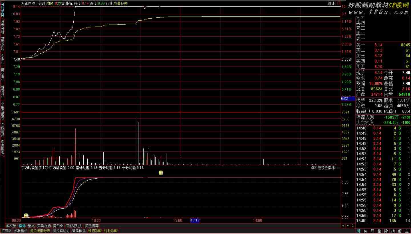 现本人再推出东方动能星的分时副图指标——东方时能星,作为东方启明星的配套指标之三。 东方战法:非强不买,决不追高。整个这套指标,都融入了这个理念。故用这套指标进行分析、决策买卖,本人称之为东方战法。 {东方时能星,(东方动能星)分时副图} {参数:M(1,30,5),N(2,60,10)} A1:=REF(C,1); A2:=DCLOSE;{通达信DCLOSE,大智慧如要使用,须去掉前面的D} A3:=(A2-A1)/A1*100; 东方动能星:A3*VOL/10000,NODRAW;{,COLOR3D;}{通达信DVOL,大智慧如要使用,须去掉前面的D} 累计动能:SUM(东方动能星,0),COLORRED,LINETHICK3; 五分均能:EMA(累计动能,M),COLORFF00FF; 十分均能:EMA(累计动能,N),COLORWHITE; STICKLINE(东方动能星>0,0,东方动能星,2,0),COLOR4D4DFF; STICKLINE(东方动能星<0,0,东方动能星,2,0),COLORCYAN; DRAWICON(CROSS(累计动能,十分均能),累计动能*1.18,5); {DRAWICON(CROSS(五分均能,累计动能),累计动能*1.18,6);}; |