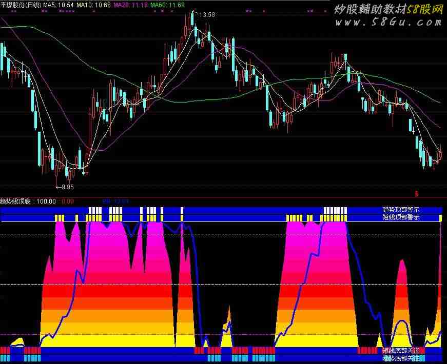 {趋势线顶底}100,COLORFFFFFF,LINETHICK3; 0,COLORRED,LINETHICK3; QSX:=3*SMA((CLOSE-LLV(LOW,27))/(HHV(HIGH,27)-LLV(LOW,27))*100,5,1) -2*SMA(SMA((CLOSE-LLV(LOW,27))/(HHV(HIGH,27)-LLV(LOW,27))*100,5,1),3,1),COLOR00CCFF,NODRAW; AA:=(((QSX-LLV(QSX,9))/(HHV(QSX,9)-LLV(QSX,9)))*(4))*(25); DRAWBAND(AA,RGB(250,250,0),0,RGB(0,0,0)); DRAWBAND(AA,RGB(250,200,0),10,RGB(0,0,0)); DRAWBAND(AA,RGB(250,150,0),20,RGB(0,0,0)); DRAWBAND(AA,RGB(250,60,0),30,RGB(0,0,0)); DRAWBAND(AA,RGB(250,0,0),40,RGB(0,0,0)); DRAWBAND(AA,RGB(250,0,80),50,RGB(0,0,0)); DRAWBAND(AA,RGB(250,0,140),60,RGB(0,0,0)); DRAWBAND(AA,RGB(250,00,180),70,RGB(0,0,0)); DRAWBAND(AA,RGB(250,0,220),80,RGB(0,0,0)); DRAWBAND(AA,RGB(250,0,250),90,RGB(0,0,0)); BB:(((QSX-LLV(QSX,27))/(HHV(QSX,27)-LLV(QSX,27)))*(4))*(25),COLORFF0000,LINETHICK3; 操盘线:=AA,COLORFFFF00,LINETHICK,LINESTICK; STICKLINE(C>0,50,50,2,0),COLORFFFFFF; STICKLINE(C>0,90,90,2,0),COLORFFFFFF; STICKLINE(C>0,10,10,2,0),COLORFF00FF; STICKLINE(C>0,100,105,4,0),COLORCC0000; STICKLINE(C>0,106,111,4,0),COLORCC0000; STICKLINE(C>0,0,-5,4,0),COLORCC0000; STICKLINE(C>0,-6,-11,4,0),COLORCC0000; STICKLINE(AA=100,100,105,2,0),COLOR00FFFF; STICKLINE(BB=100,106,111,2,0),COLORFFFFFF; STICKLINE(AA=0,0,-5,2,0),COLOR0000FF; STICKLINE(BB=0,-6,-11,2,0),COLORCCCC00; DRAWTEXT(CURRBARSCOUNT=18,109,'趋势顶部警示'),COLORFFFFFF; DRAWTEXT(CURRBARSCOUNT=18,103,'短线顶部警示'),COLORFFFFFF; DRAWTEXT(CURRBARSCOUNT=18,-3,'短线底部关注'),COLORFFFFFF; DRAWTEXT(CURRBARSCOUNT=18,-9,'趋势底部关注'),COLORFFFFFF;