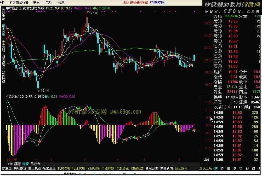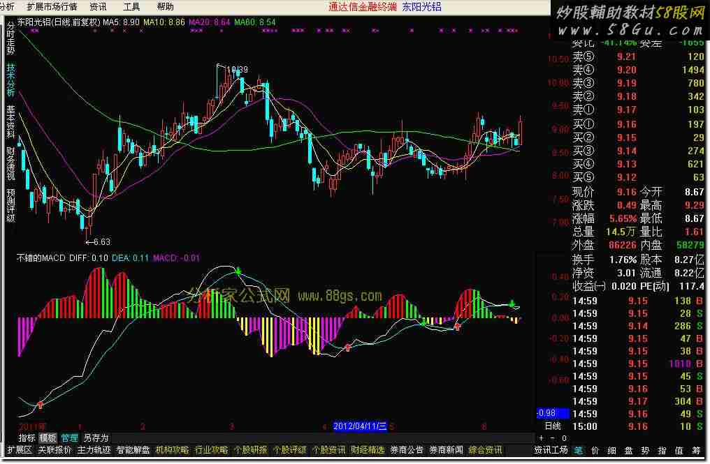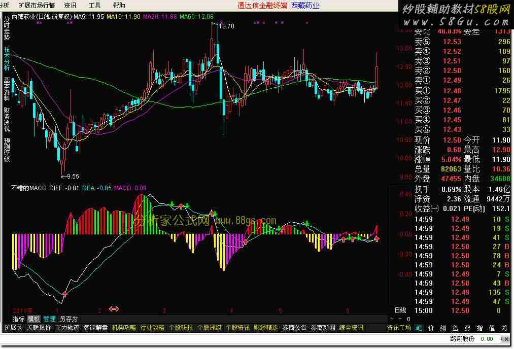 DIFF:EMA(DCLOSE,12)-EMA(DCLOSE,26);DEA:EMA(DIFF,9),COLORFFFF00;MACD:(DIFF-DEA)*2;STICKLINE(MACD>=0 AND MACD>=REF(MACD,1),0,MACD,1,0),COLORRED;STICKLINE(MACD>=0 AND MACD<=REF(MACD,1),0,MACD,1,0),COLORGREEN;STICKLINE(MACD<=0 AND MACD>=REF(MACD,1),0,MACD,1,0),COLORFF00FF;STICKLINE(MACD<=0 AND MACD<=REF(MACD,1),0,MACD,1,0),COLOR00FFFF;DRAWICON(CROSS(DIFF,DEA),DEA,1);DRAWICON(CROSS(DEA,DIFF),DEA,2);   |