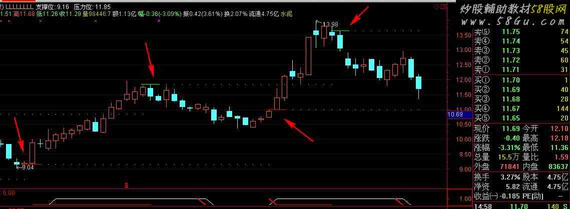 指标改一下,方便操作改一改更清晰,支撑与压力主图!! RSV1:=(CLOSE-LLV(LOW,13))/(HHV(HIGH,13)-LLV(LOW,13))*100; RSV2:=(CLOSE-LLV(LOW,55))/(HHV(HIGH,55)-LLV(LOW,55))*100; J1:=3*SMA(RSV1,3,1)-2*SMA(SMA(RSV1,3,1),3,1); J2:=3*SMA(RSV2,3,1)-2*SMA(SMA(RSV2,3,1),3,1); 支撑位:IF(CROSS(J1,J2),LOW,REF(LOW,BARSLAST(CROSS(J1,J2)))),POINTDOT; STICKLINE( CROSS(J1,J2),LOW,REF(LOW,BARSLAST(CROSS(J1,J2))),9,0),COLORRED; 压力位:IF(CROSS(J2,J1),HIGH,REF(HIGH,BARSLAST(CROSS(J2,J1)))),POINTDOT; STICKLINE( CROSS(J2,J1),HIGH,REF(HIGH,BARSLAST(CROSS(J2,J1))),9,0),COLORGREEN;