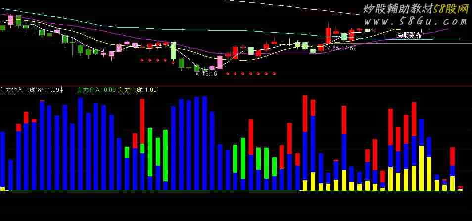 N1:=34; N2:=9; N3:=3; X1: 100*(HHV(HIGH,N1)-CLOSE)/(HHV(HIGH,N1)-LLV(LOW,N1)),NODRAW; VAR1:=100*(HHV(HIGH,N2)-CLOSE)/(HHV(HIGH,N2)-LLV(LOW,N2)); VAR2:=100*(HHV(HIGH,N3)-CLOSE)/(HHV(HIGH,N3)-LLV(LOW,N3)); VAR3:=VAR1-X1; VAR4:=X1-VAR1; STICKLINE(X1>=0,0,VAR2,2,0)COLORRED; 绿色主力介入: STICKLINE(VAR3<0,0,VAR4,2,0)COLORGREEN; STICKLINE(X1>=0,0,VAR1,2,0)COLORBLUE; 黄色主力出货: STICKLINE(VAR4<0,0,VAR3,2,0)COLORYELLOW;主力介入:VAR3<0,COLORGREEN; 主力出货:VAR4<0,COLORYELLOW;