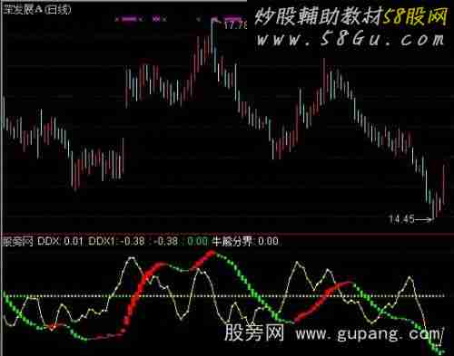 N:=20;jj:=(HIGH+LOW+CLOSE)/3;qj0:=vol/IF(HIGH=LOW,4,HIGH-LOW); qj1:=IF(CAPITAL=0,qj0*(jj-MIN(CLOSE,OPEN)),qj0*IF(HIGH=LOW,1,(MIN(OPEN,CLOSE)-LOW))); qj2:=IF(CAPITAL=0,qj0*(MIN(OPEN,CLOSE)-LOW),qj0*IF(HIGH=LOW,1,(jj-MIN(CLOSE,OPEN)))); qj3:=IF(CAPITAL=0,qj0*(HIGH-MAX(OPEN,CLOSE)),qj0*IF(HIGH=LOW,1,(HIGH-MAX(OPEN,CLOSE)))); qj4:=IF(CAPITAL=0,qj0*(MAX(CLOSE,OPEN)-jj),qj0*IF(HIGH=LOW,1,(MAX(CLOSE,OPEN)-jj))); DDX:((qj1+qj2)-(qj3+qj4))/sum(vol,60)*1,COLOR00aaaa,LINETHICK0;DX:=ma(ddx,5)*n; DDX1:sma(DX,3,1)*10,COLORyellow; {变色} if(DDX1>ref(DDX1,1),DDX1,0),Circledot,COLORYELLOW,LINETHICK1; if(DDX1<ref(DDX1,1),DDX1,0),Circledot,COLOR00FF00,LINETHICK1; {只做红波段} VAR1:=EMA(CLOSE,13)-EMA(CLOSE,55); VAR2:=EMA(VAR1,3); VAR3:=VAR1>VAR2; VAR4:=VAR1<VAR2; 牛熊分界:0,COLORwhite,LINETHICK2,POINTDOT; STICKLINE(VAR3,VAR1,VAR2,4,0),COLORRED; STICKLINE(VAR4,VAR1,VAR2,2,0),COLORGREEN; |
