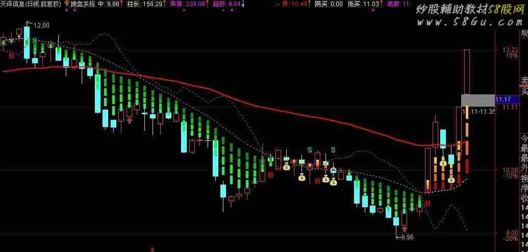 短:=EMA(C,3),DOTLINE; 买线:=短; 中:EMA(SLOPE(C,21)*20+C,55),DOTLINE; 卖线:=中; 柱长:(买线-卖线)*100,NODRAW; 买卖差:=买线-卖线; 趋势:(46.18*EMA(CLOSE,10)-31.82*EMA(CLOSE,4))/14.36,COLORMAGENTA,LINETHICK1,DOTLINE; X1:=(C+L+H)/3; X2:=EMA(X1,6); X3:=EMA(X2,5); DRAWICON(CROSS(X2,X3),L*0.98,7); DRAWICON(CROSS(X3,X2),H*1.02,8); STICKLINE(买卖差>=0,(买线-买卖差*0.2),(买线-买卖差*0.35),1,0) ,COLOR00CCFF; STICKLINE(买卖差>=0,(买线-买卖差*0.4),(买线-买卖差*0.55),1,0) ,COLOR0099FF; STICKLINE(买卖差>=0,(买线-买卖差*0.6),(买线-买卖差*0.75),1,0) ,COLOR0066FF; STICKLINE(买卖差>=0,(买线-买卖差*0.8),(买线-买卖差*0.95),1,0) ,COLOR0000CC; STICKLINE(买卖差<0,(卖线+买卖差*0.2),(卖线+买卖差*0.35),1,0) ,COLOR009900; STICKLINE(买卖差<0,(卖线+买卖差*0.4),(卖线+买卖差*0.55),1,0) ,COLOR00CC00; STICKLINE(买卖差<0,(卖线+买卖差*0.6),(卖线+买卖差*0.75),1,0) ,COLOR00FF00; STICKLINE(买卖差<0,(卖线+买卖差*0.8),(卖线+买卖差*0.95),1,0) ,COLOR66FF00; IF(卖线<REF(卖线,1),卖线,DRAWNULL),COLORGREEN,DOTLINE; {DRAWKLINE(HIGH,OPEN,LOW,CLOSE);} 界:EMA(C,60),COLORRED,LINETHICK2; 阴买:IF(买线>卖线 AND C<O,1,0),NODRAW; DRAWICON(阴买,L*0.99,9); |
