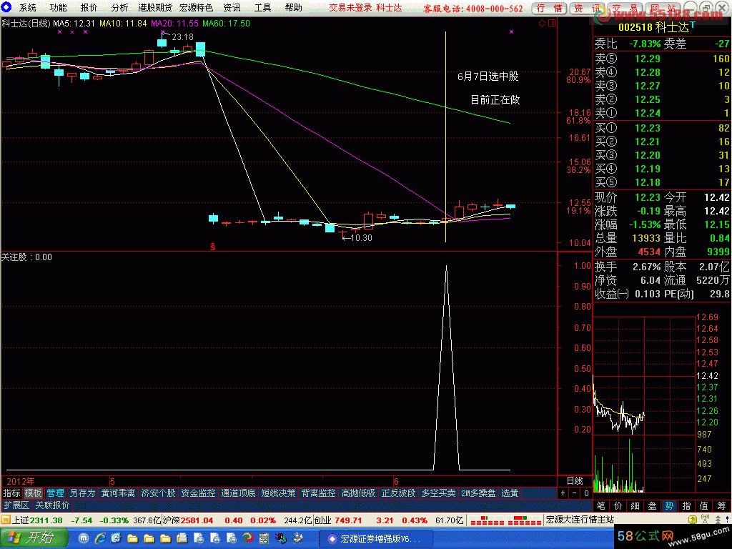 自编指标构思:大盘在低位震荡中,破5天线,3天后又重新站上5天线的个股,是有关注价值的股票。 指标用法:收盘后选出标的股票,要按走势特征复选,如果次日又破5日线,就是骗线股,坚决回避! 指标性质:该指标属于走势特征选股,非形态特征选股。该指标一标二用,可做技术分析指标(付图),也可做选股公式用。 V11:=3*SMA((C-LLV(L,55))/(HHV(H,55)-LLV(L,55))*100,5,1)-2*SMA(SMA((C-LLV(L,55))/(HHV(H,55)-LLV (L,55))*100,5,1),3,1); 趋势线:=EMA(V11,3); CROSS(REF(MA(C,5),3),REF(C,3)) AND CROSS(C,MA(C,5)) AND 趋势线<30; |