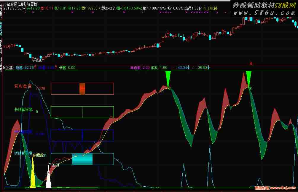 获利盘:=WINNER(C)*100,COLOR00FFFF,LINETHICK1; HLPMA5:=MA(获利盘,5),COLORFF00FF,LINETHICK1; HLPMA53:=SMA(HLPMA5,3,1),COLOR0000FF,LINETHICK2; DRAWBAND(HLPMA5,RGB(158,58,58),HLPMA53,RGB(0,100,50)); 短套:EMA(100*(1-WINNER(1.10*C)),1),COLORFFDD00,LINETHICK1; 中套:EMA(100*(1-WINNER(1.20*C)),1),COLORFF0000 ,LINETHICK1; 长套:EMA(100*(1-WINNER(1.5*C)),1),COLOR00FF00,LINETHICK2; WLT1:=短套>95; WLT2:=中套>80; WLT3:=长套>60; WLT4:=长套>70; WLT5:=中套>85; TJ1:=WLT1>REF(WLT1,1) AND WLT2>REF(WLT2,1) AND WLT3>REF(WLT3,1); BT001:=WLT1 AND WLT2 AND WLT3 AND WLT3>REF(WLT3,1); BT002:=WLT1 AND WLT2>REF(WLT2,1); BT003:=WLT1 AND WLT4 AND WLT5; BT004:=WLT1 AND WLT4 AND WLT5 AND TJ1; TJ2:=CROSS(90,短套) AND 中套>60 ; TJ3:=COUNT(短套>85 AND 中套>60 ,10)>7 AND CROSS(80,短套); TJ4:=FILTER(短套>85 AND 中套>70 AND 长套>40,5); TJ6:=短套>90 AND 中套>75; TJ5:=短套>85 AND 中套>70 AND 长套>40; {IF(TJ6,5,0),COLOR00FFFF,LINETHICK2; 建仓区:IF(TJ5,5,0),COLOR0018FF,LINETHICK2; DRAWTEXT(FILTER(TJ5,13),5,'建仓区'),COLOR0088FF;}STICKLINE(CURRBARSCOUNT=90,80,90,100,1),COLOR0033FF; STICKLINE(CURRBARSCOUNT=90,80,90,获利盘,0),COLOR003388; STICKLINE(CURRBARSCOUNT=90,82,88,获利盘,0),COLOR0033AA; STICKLINE(CURRBARSCOUNT=90,83.5,86.5,获利盘,0),COLOR0033CC; STICKLINE(CURRBARSCOUNT=90,84.9,85.1,获利盘,0),COLOR0033FF; DRAWTEXT(CURRBARSCOUNT=116,87,'获 利 盘 度:'),COLOR0033FF; DRAWNUMBER(CURRBARSCOUNT=108,87,CONST(获利盘)),COLOR0033FF;STICKLINE(CURRBARSCOUNT=90,20,30,100,1),COLORFFFF00; STICKLINE(CURRBARSCOUNT=90,20,30,短套,0),COLOR888800; STICKLINE(CURRBARSCOUNT=90,22,28,短套,0),COLORAAAA00; STICKLINE(CURRBARSCOUNT=90,23.5,26.5,短套,0),COLORCCCC00; STICKLINE(CURRBARSCOUNT=90,24.9,25.1,短套,0),COLORFFFF00; DRAWTEXT(CURRBARSCOUNT=116,30,'短线套牢度:'),COLORFFFF00; DRAWNUMBER(CURRBARSCOUNT=108,30,CONST(短套)),COLORFFFF00;STICKLINE(CURRBARSCOUNT=90,40,50,100,1),COLORFF0000; STICKLINE(CURRBARSCOUNT=90,40,50,中套,0),COLOR880000; STICKLINE(CURRBARSCOUNT=90,42,48,中套,0),COLORAA0000; STICKLINE(CURRBARSCOUNT=90,43.5,46.5,中套,0),COLORCC0000; STICKLINE(CURRBARSCOUNT=90,44.9,45.1,中套,0),COLORFF0000; DRAWTEXT(CURRBARSCOUNT=116,48,'中线套牢度:'),COLORFF0000; DRAWNUMBER(CURRBARSCOUNT=108,48,CONST(中套)),COLORFF0000;STICKLINE(CURRBARSCOUNT=90,60,70,100,1),COLOR00FF00; STICKLINE(CURRBARSCOUNT=90,60,70,长套,0),COLOR008833; STICKLINE(CURRBARSCOUNT=90,62,68,长套,0),COLOR00AA33; STICKLINE(CURRBARSCOUNT=90,63.5,66.5,长套,0),COLOR00CC33; STICKLINE(CURRBARSCOUNT=90,64.9,65.1,长套,0),COLOR00FF33; DRAWTEXT(CURRBARSCOUNT=116,67,'长线套牢度:'),COLOR00FF00; DRAWNUMBER(CURRBARSCOUNT=108,67,CONST(长套)),COLOR00FF00;JLBT:=FILTER(TJ1 OR TJ2 OR TJ3 OR TJ4 OR BT001 OR BT002 OR BT003 OR BT004,5); DRAWBAND(0,RGB(0,0,0),JLBT*28,RGB(250,250,18)); DRAWTEXT(JLBT,28,'金项链'),COLOR00FFFF; DXBT01:=LONGCROSS(73.8,短套,5) AND 中套>20 AND 长套>1; DXBT02:=COUNT(短套>70,13)>9 AND CROSS(71,短套) AND 中套>20; YLBT:=FILTER(DXBT01 OR DXBT02,3); DRAWBAND(0,RGB(0,0,0),YLBT*20,RGB(250,250,250)); DRAWTEXT(YLBT,20,'白金链'),COLORFFFFFF; MT:=BARSLAST(REF(CROSS(75,短套),1)); ZLBT:=(MT<21 AND MT>3 AND 短套<REF(短套,MT+1) AND CROSS(75,短套)); DRAWBAND(0,RGB(0,0,0),ZLBT*33,RGB(250,18,18)); DRAWTEXT(ZLBT,33,'钻链'),COLOR0000FF;CRBT:=FILTER((CROSS(HLPMA5,长套) OR CROSS(HLPMA5,HLPMA53)) AND 获利盘<10 AND LAST(长套>1.618,5,0),8); DRAWBAND(0,RGB(0,0,0),CRBT*38,RGB(250,168,18)); DRAWTEXT(CRBT,40,'金叉'),COLOR0078FF; XG:=JLBT OR YLBT OR ZLBT OR CRBT; 年选股:SUM(XG,250),NODRAW; 利润:=REF(XG,20) AND HHV(H,20)>=REF(C,20)*1.10; 成功:SUM(利润,250),NODRAW; 成功率%:=成功/年选股*100,NODRAW;ST1:=FILTER(CROSS(获利盘,HLPMA5) AND HLPMA5>80,5) AND 中套=0; ST2:=FILTER(COUNT(CROSS(获利盘,HLPMA5),15)>=3 AND HLPMA5>61.8,15) AND C<MA(C,3); ST:=(ST1 OR ST2); DRAWBAND(100,RGB(0,250,0),(100-ST*15),RGB(18,250,18)); DRAWTEXT(ST,85,'卖'),COLOR00FF00; IF(HLPMA5>=HLPMA53,HLPMA5,DRAWNULL),COLORRED; IF(HLPMA53>=HLPMA5,HLPMA53,DRAWNULL),COLORFF9900; IF(HLPMA5>=HLPMA53,HLPMA53,DRAWNULL),COLOR00FFFF; IF(HLPMA53>=HLPMA5,HLPMA5,DRAWNULL),COLOR00FF00;