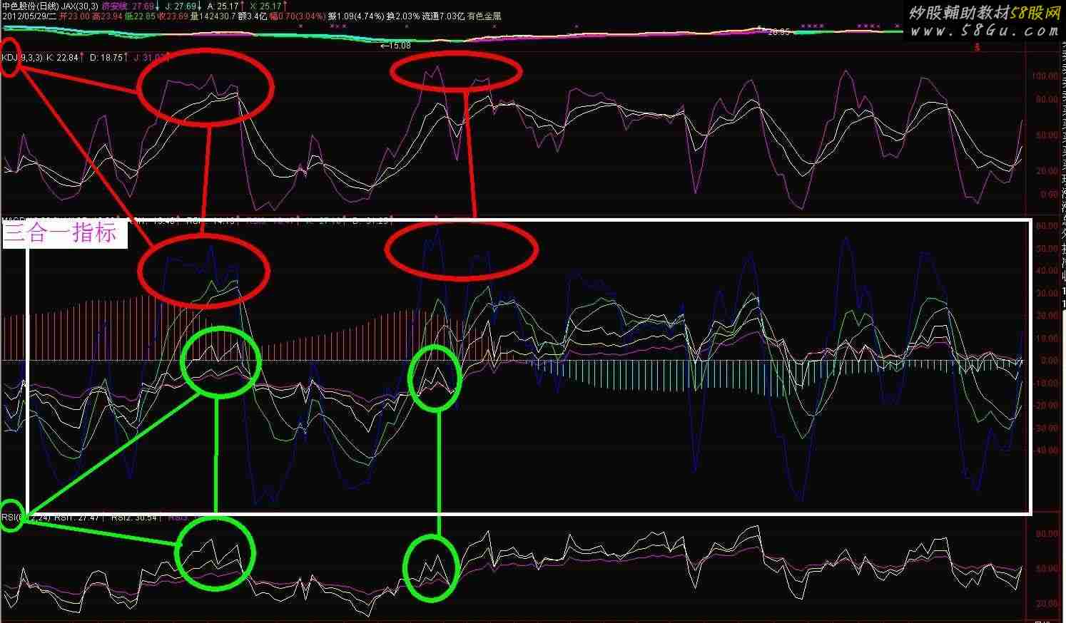 DIF:=EMA(CLOSE,12)-EMA(CLOSE,26); DEA:=EMA(DIF,9)*10; MACD:(DIF-DEA)*2,COLORSTICK; LC:=REF(CLOSE,1); RSI1:SMA(MAX(CLOSE-LC,0),12,1)/SMA(ABS(CLOSE-LC),12,1)*100-50; RSI2:SMA(MAX(CLOSE-LC,0),24,1)/SMA(ABS(CLOSE-LC),24,1)*100-50; RSI3:SMA(MAX(CLOSE-LC,0),36,1)/SMA(ABS(CLOSE-LC),36,1)*100-50; RSV:=(CLOSE-LLV(LOW,9))/(HHV(HIGH,9)-LLV(LOW,9))*100-50; K:SMA(RSV,3,1); D:SMA(K,3,1); J:3*K-2*D; |