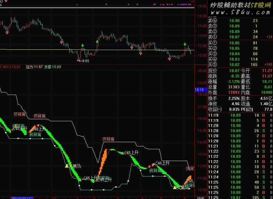 买卖操盘SAT:=IF((AMOUNT/C)/(HHV(AMOUNT,20)/HHV(C,20))*100>100,100,(AMOUNT/C)/(HHV(AMOUNT,20)/HHV(C,20))*100); AA10:MA(CLOSE,8),COLOR0000FF; AA12:MA(CLOSE,12),COLOR0000FF; BB10:=((ATAN((AA10 - REF(AA10,1))) * 3.1416) * 10); BB12:=((ATAN((AA12 - REF(AA12,1))) * 3.1416) * 10); MA13:=MA(CLOSE,13); STICKLINE((((AA12 <= AA10) AND (BB12 >= 1)) AND (BB10 >= 1)),AA10,AA12,4,0),COLOR0080FF; STICKLINE((((AA12 >= AA10) AND (BB10 <= 1)) AND (BB10 <= 1)),AA10,AA12,4,0),COLOR00FF00; X1:=(C+L+H)/3; BB13:=ATAN(EMA(X1,13)-REF(EMA(X1,13),1))*3.1416*10; EMA8:=EMA(C,8); DRAWTEXT(FILTER(BB13>1 AND EMA(X1,13)>REF(EMA(X1,8),1),10),EMA8,'∠45上升'),COLORWHITE;压力:MA(REF(HHV(C,30),1),2),COLOR9DFFFF; 支撑:MA(REF(LLV(C,30),1),2),COLORABFF46; AA1:=AMOUNT/V;BB1:=L<AA1*0.9; CC1:=(C-REF(C,1))/REF(C,1)*100>1.2; DD1:=L<MA(C,5)*0.921;EE1:=V<MA(V,5)*1.5; FF1:=BB1 AND CC1 AND DD1 AND EE1;DRAWTEXT(FF1,(LOW* 0.99),'老鼠仓'),COLOR4080FF; A51:=3*SMA((C-LLV(L,55))/(HHV(H,55)-LLV(L,55))*100,5,1)-2*SMA((C-LLV(L,55))/(HHV(H,55)-LLV(L,55))*100,5,1); 黑码线:=EMA(A51,5); A54:=((C-LLV(L,21))/(HHV(H,21)-LLV(L,21)))*100; 趋势线:=(MA(3*SMA(A54,6,1)-2*SMA(SMA(A54,5,1),5,1),2)); DRAWTEXT(CROSS(趋势线,0)AND 黑码线<40,(HIGH* 0.97),'▲大黑码'),COLORYELLOW; LC:=REF(CLOSE,1); RSI:=((SMA(MAX((CLOSE - LC),0),3,1) / SMA(ABS((CLOSE - LC)),3,1)) * 100); FF:=EMA(CLOSE,3); MA15:=EMA(CLOSE,21); DRAWTEXT(CROSS(FF,MA15),(LOW * 0.99),'底背离'),COLORA6E500; DRAWTEXT(CROSS(88,RSI),(HIGH * 1.02),'顶背离'),COLOR1880FF; VAR2:=LLV(LOW,27);VAR3:=HHV(HIGH,34); VAR4:=EMA((CLOSE-VAR2)/(VAR3-VAR2)*4,4)*25; {注意买:=IF((VAR4<10),15,30);} 注意买:=VAR4<10; RSV:=(C-LLV(L,9))/(HHV(H,9)-LLV(L,9))*100; K:=SMA(RSV,3,1); D:=SMA(K,3,1); J:=3*K-2*D; {超跌:IF(J<0,10,0);} 超跌:=J<0; BDDD:=LLV(J,2)=LLV(J,8); {买入:=IF(CROSS(J,REF(J+0.01,1)) AND BDDD AND J<20,25,0);} 买入:=CROSS(J,REF(J+0.01,1)) AND BDDD AND J<20; DRAWTEXT(买入 AND 注意买=100 AND 超跌=0,LOW,'短线'),COLOR8000FF; MTM:=C-REF(C,1);DX:=100*EMA(EMA(MTM,6),6)/EMA(EMA(ABS(MTM),6),6); {买:=IF(LLV(DX,2)=LLV(DX,7) AND COUNT(DX<0,2) AND CROSS(DX,MA(DX,2)),1,0);} 买:=LLV(DX,2)=LLV(DX,7) AND COUNT(DX<0,2) AND CROSS(DX,MA(DX,2)); |