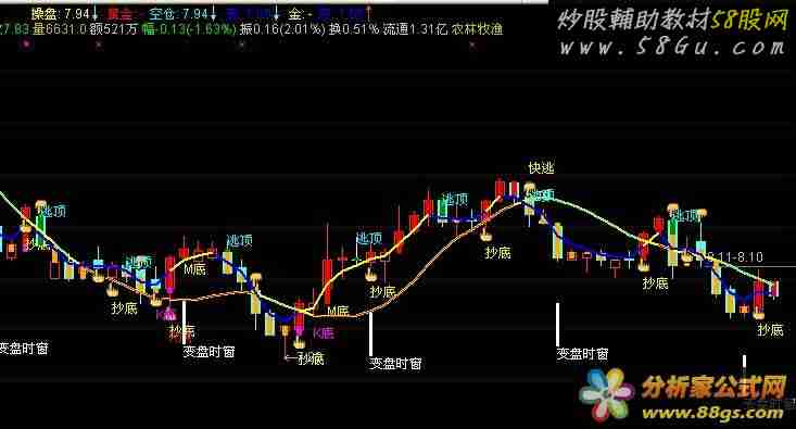VAR1:=CLOSE>REF(CLOSE,1) AND CLOSE>REF(CLOSE,2); VAR2:=REF(VAR1,1) AND CLOSE<=REF(CLOSE,1) AND CLOSE>=REF(CLOSE,2); VAR3:=REF(VAR2,1) AND CLOSE>=REF(CLOSE,1) AND CLOSE<=REF(CLOSE,2); VAR4:=REF(VAR3,1) AND CLOSE<=REF(CLOSE,1) AND CLOSE>=REF(CLOSE,2); VAR5:=REF(VAR4,1) AND CLOSE>=REF(CLOSE,1) AND CLOSE<=REF(CLOSE,2); VAR6:=REF(VAR5,1) AND CLOSE<=REF(CLOSE,1) AND CLOSE>=REF(CLOSE,2); VAR7:=REF(VAR6,1) AND CLOSE>=REF(CLOSE,1) AND CLOSE<=REF(CLOSE,2); VAR8:=REF(VAR7,1) AND CLOSE<=REF(CLOSE,1) AND CLOSE>=REF(CLOSE,2); VAR9:=REF(VAR8,1) AND CLOSE>=REF(CLOSE,1) AND CLOSE<=REF(CLOSE,2); VARA:=REF(VAR9,1) AND CLOSE<=REF(CLOSE,1) AND CLOSE>=REF(CLOSE,2); VARB:=REF(VARA,1) AND CLOSE>=REF(CLOSE,1) AND CLOSE<=REF(CLOSE,2); VARC:=REF(VARB,1) AND CLOSE<=REF(CLOSE,1) AND CLOSE>=REF(CLOSE,2); STICKLINE(VAR1 OR VAR2 OR VAR3 OR VAR4 OR VAR5 OR VAR6 OR VAR7 OR VAR8 OR VAR9 OR VARA OR VARB OR VARC,CLOSE,REF(CLOSE,1),1,0),COLOR0000FF; VARD:=CLOSE<REF(CLOSE,1) AND CLOSE<REF(CLOSE,2); VARE:=REF(VARD,1) AND CLOSE>=REF(CLOSE,1) AND CLOSE<=REF(CLOSE,2); VARF:=REF(VARE,1) AND CLOSE<=REF(CLOSE,1) AND CLOSE>=REF(CLOSE,2); VAR10:=REF(VARF,1) AND CLOSE>=REF(CLOSE,1) AND CLOSE<=REF(CLOSE,2); VAR11:=REF(VAR10,1) AND CLOSE<=REF(CLOSE,1) AND CLOSE>=REF(CLOSE,2); VAR12:=REF(VAR11,1) AND CLOSE>=REF(CLOSE,1) AND CLOSE<=REF(CLOSE,2); VAR13:=REF(VAR12,1) AND CLOSE<=REF(CLOSE,1) AND CLOSE>=REF(CLOSE,2); VAR14:=REF(VAR13,1) AND CLOSE>=REF(CLOSE,1) AND CLOSE<=REF(CLOSE,2); VAR15:=REF(VAR14,1) AND CLOSE<=REF(CLOSE,1) AND CLOSE>=REF(CLOSE,2); VAR16:=REF(VAR15,1) AND CLOSE>=REF(CLOSE,1) AND CLOSE<=REF(CLOSE,2); VAR17:=REF(VAR16,1) AND CLOSE<=REF(CLOSE,1) AND CLOSE>=REF(CLOSE,2); VAR18:=REF(VAR17,1) AND CLOSE>=REF(CLOSE,1) AND CLOSE<=REF(CLOSE,2); STICKLINE(VARD OR VARE OR VARF OR VAR10 OR VAR11 OR VAR12 OR VAR13 OR VAR14 OR VAR15 OR VAR16 OR VAR17 OR VAR18,CLOSE,REF(CLOSE,1),1,0),COLOR00AAFF; VAR19:=REF(VARD OR VARE OR VARF OR VAR10 OR VAR11 OR VAR12 OR VAR13 OR VAR14 OR VAR15 OR VAR16 OR VAR17 OR VAR18,1) AND VAR1; STICKLINE(VAR19,REF(CLOSE,1),REF(CLOSE,2),1,0),COLORMAGENTA; DRAWICON(VAR19,L*0.995,11); DRAWTEXT(VAR19,L*0.985,'抄底'),COLORYELLOW; VAR1A:=REF(VAR1 OR VAR2 OR VAR3 OR VAR4 OR VAR5 OR VAR6 OR VAR7 OR VAR8 OR VAR9 OR VARA OR VARB OR VARC,1) AND VARD; STICKLINE(VAR1A,REF(CLOSE,1),REF(CLOSE,2),1,0),COLOR008800; RSV:=(CLOSE-LLV(LOW,13))/(HHV(HIGH,13)-LLV(LOW,13))*100; K:=SMA(RSV,3,1); D:=SMA(K,3,1); J:=3*K-2*D;