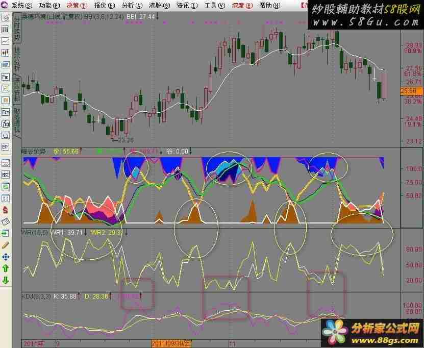 {峰谷价势 - - 壹瓣杺埖 } SS:=PERIOD; 自:=100*(HHV(H,6)-C)/(HHV(H,6)-LLV(L,6)); 然:=100*(HHV(H,10)-C)/(HHV(H,10)-LLV(L,10)); 峰1:=IF(自<50,自+70,120); DRAWBAND(120,RGB(0,30,250),峰1,RGB(0,30,250)); 谷1:=IF(自>50,自-50,0); DRAWBAND(谷1,RGB(160,88,8),0,RGB(160,88,8)); R9:=IF(SS=2,80,9); RK3:=IF(SS=2,3,9); RD3:=IF(SS=2,10,9); RSV:=(C-LLV(L,R9))/(HHV(H,R9)-LLV(L,R9))*100; K:=SMA(RSV,RK3,1); D:=SMA(K,RD3,1); J:=3*K-2*D; 峰2:=IF(然<50,然+70,120); 谷2:=IF(然>50,然-50,0); CS:=(C-LLV(L,8))/(HHV(H,8)-LLV(L,8))*100; 价:EMA(CS,3)*1.25,COLOR00FFFF,LINETHICK3; 价势:=J*1.1; DRAWBAND(价,RGB(0,180,220),IF(价>峰2,峰2,价),RGB(0,180,220)); DRAWBAND(价势,RGB(120,8,138),IF(价势<谷1,谷1,价势),RGB(120,8,138)); DRAWBAND(价势,RGB(0,0,130),IF(价势>峰1,峰1,价势),RGB(0,0,130)); DRAWBAND(价,RGB(250,96,96),IF(价<谷2,谷2,价),RGB(250,96,96)); 势:EMA((0.668*REF(价势,1)+0.333*价势),1),COLOR00EE00,LINETHICK2; 峰:峰2,COLOR8E00E8,LINETHICK2; 谷:谷2,COLORFFFFFF,LINETHICK2; |