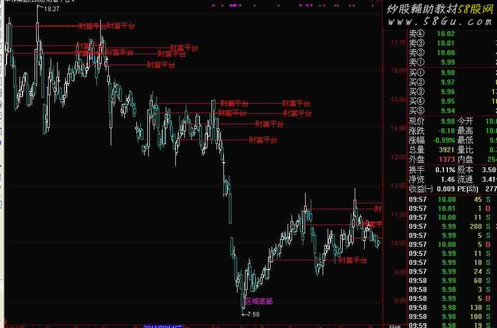 STICKLINE(C>=O,H,L,0,0),COLORFFFFFF; STICKLINE(C>=O,C,O,7,1),COLORFFFFFF; STICKLINE(C<O,H,L,0,0),COLORB6B600; STICKLINE(C<O,C,O,7,1),COLORB6B600; B1:='--------------------财富平台'; DRAWTEXT(VOL=HHV(VOL,20),C ,B1),COLORRED;VARM2:=(CLOSE-LLV(LOW,21))/(HHV(HIGH,21)-LLV(LOW,21))*100; VARM3:=SMA(SMA(VARM2,9,4),9,4)/7.777777; VARM4:=EMA(VARM3,5); VARM5:=3*VARM3-2*VARM4; AAM:=CROSS(VARM5,VARM3) AND VARM3<1.7777777 AND C>O; VARM6:=(2*CLOSE+HIGH+LOW)/4; VARM7:=LLV(LOW,13); VARM8:=HHV(HIGH,13); VARM9:=EMA((VARM6-VARM7)/(VARM8-VARM7)*100,13); VARMA:=EMA(0.667*REF(VARM9,1)+0.333*VARM9,2); DRAWTEXT(AAM,L,'区域底部'),COLORMAGENTA;