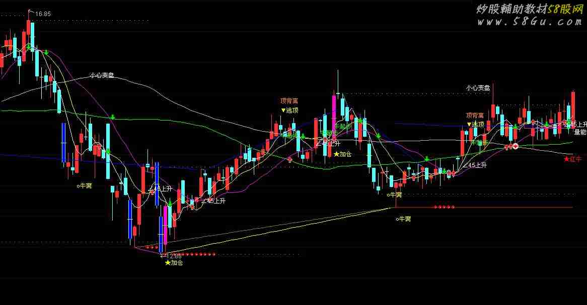 MA5:MA(C,5),COLORWHITE; MA10:MA(C,10),COLORYELLOW; MA20:MA(C,20),COLORMAGENTA; MA60:MA(C,60),COLORGREEN; MA120:MA(C,120),COLORLIGRAY; MA240:MA(C,240),COLORBLUE; 上攻:=IF((C/REF(C,1)>=1.04),1,0); STICKLINE(上攻,O,C,1,0),COLORMAGENTA; STICKLINE((C/REF(C,1)>=1.04) ,(C-O)/2+O, (C-O)/2+O,4,2),LINETHICK2,COLORGREEN; 涨停:=IF((C-REF(C,1))*100/REF(C,1)>=(10- 0.01*100/REF(O,1)),1,0); STICKLINE(涨停,O,C,2,0),COLORYELLOW; 杀跌:=IF((C/REF(C,1)<=0.96),1,0); STICKLINE(杀跌,O,C,1,0),COLORBLUE; STICKLINE((C/REF(C,1)<=0.97) ,(O-C)/2+C, (O-C)/2+C,4,2),LINETHICK2,COLORYELLOW; 跌停:=IF((C/REF(C,1)<=0.9),1,0); STICKLINE(跌停,O,C,2,0),COLORGREEN; 豆豆:=C; A1:=REF(豆豆,10)=HHV(豆豆,2*10+1); B1:=FILTER(A1,10); C1:=BACKSET(B1,10+1); HD:=FILTER(C1,10); A2:=REF(豆豆,10)=LLV(豆豆,2*10+1); B2:=FILTER(A2,10); C2:=BACKSET(B2,10+1); LD:=FILTER(C2,10); A:=REF(C,BARSLAST(HD)); B:=REF(L,BARSLAST(LD)); T1:=BARSLAST(HD)<BARSLAST(LD) AND NOT(HD); T2:=BARSLAST(HD)>BARSLAST(LD) AND NOT(LD); 压力:IF (T1,A,A),COLORYELLOW,POINTDOT,LINETHICK3; 支撑:IF (T2,B,B),COLORGREEN,POINTDOT,LINETHICK3; DRAWICON(CROSS(MA5,MA10),MA10,1); DRAWICON(CROSS(MA10,MA20),MA20,1); DRAWICON(CROSS(MA20,MA60),MA60,1); DRAWICON(CROSS(MA20,MA120),MA120,1); DRAWICON(CROSS(MA20,MA240),MA240,1); DRAWICON(CROSS(MA60,MA120),MA60,23); DRAWICON(CROSS(MA60,MA240),MA240,23); DRAWICON(CROSS(MA120,MA240),MA240,23); DRAWICON(CROSS(MA10,MA5),MA10,2); DRAWICON(CROSS(MA20,MA10),MA20,2); DRAWICON(CROSS(MA60,MA20),MA60,2); DRAWICON(CROSS(MA120,MA60),MA60,24); MA30:=MA(C,30); FA:=BARSLAST(CROSS(MA10,MA5)) AND CROSS(MA5,MA10); FB:=FA AND MA5>MA30 AND MA10>MA30 AND MA10>REF(MA10,1); DRAWTEXT(FB,L-0.58,'★红牛'),COLORRED; V1:=EMA(CLOSE,5); V2:=EMA(EMA(CLOSE,90)*1.01,10); DRAWTEXT(CROSS(V1,V2),V1+0.05,'牛起步'),COLOR00FF00; VAR1:=LLV(LOW,21); VAR2:=HHV(HIGH,21); AK1:=EMA((((CLOSE - VAR1) / (VAR2 - VAR1)) * 100),5); AK:=EMA((((CLOSE - VAR1) / (VAR2 - VAR1)) * 50),13); AB:=CROSS(AK1,AK); DRAWTEXT((AB = 1),(LOW * 0.99),'○牛窝'),COLORYELLOW; AA1:=AMOUNT/V; BB1:=L<AA1*0.9; CC1:=(C-REF(C,1))/REF(C,1)*100>1.2; DD1:=L<MA(C,5)*0.921; EE1:=V<MA(V,5)*1.5; 老鼠仓:=BB1 AND CC1 AND DD1 AND EE1,LINETHICK0,COLOR0099FF; DRAWTEXT(老鼠仓,L*0.99,'老鼠仓'),COLOR0099FF; VAR3AA:=IF((CLOSE>REF(CLOSE,1)),88,0); VAR4AA:=IF(((CLOSE)/(REF(CLOSE,1))>1.05) AND ((HIGH)/(CLOSE)<1.01) AND (VAR3AA>0),91,0); DRAWTEXT(FILTER((VAR4AA>90),45),(LOW)*(0.93),'★大胆搏 '),COLOR00FFFF; DRAWTEXT(FILTER((VAR4AA>90),35),(LOW)*(0.99000001),'★加仓'),COLOR00FFFF; A1AA:=9; A2AA:=(REF(CLOSE,A1AA+1)<CLOSE); DRAWTEXT(FILTER((A2AA>-0.5),84),(HIGH)*(1.05),'小心变盘'),COLORFFFFFF; VAR6:=REF(C,1); VAR7:=SMA(MAX(C-VAR6,0),6,1)/SMA(ABS(C-VAR6),6,1)*100; DRAWTEXT(CROSS(82,VAR7),H*1.01,'▼逃顶'),COLORYELLOW;N:=5; A11:=BACKSET(ISLASTBAR,TROUGHBARS(2,N,1)+1); A21:=A11>REF(A11,1); B11:=BACKSET(ISLASTBAR,TROUGHBARS(2,N,2)+1); B21:=B11>REF(B11,1); C11:=BACKSET(ISLASTBAR,TROUGHBARS(2,N,3)+1); C21:=C11>REF(C11,1); ①:DRAWLINE(B2,H,A2,H,0),COLORBLUE; ②:DRAWLINE(C2,H,B2,H,0),COLORCC6633; ③:IF(A1,PEAK(1,N,1),DRAWNULL),COLORFFAA00; ④:DRAWLINE(C2,H,A2,H,0),COLORLIBLUE; ⑤:DRAWLINE(B21,L,A21,L,0),COLORYELLOW; ⑥:DRAWLINE(C21,L,B21,L,0),COLORFF00FF; ⑦:DRAWLINE(C21,L,A21,L,0),COLORBROWN; ⑧:IF(A11,TROUGH(2,N,1),DRAWNULL),COLORRED; T0:IF(CURRBARSCOUNT<=N+7,CONST(IF(T1=0,C,REF(C,T1))),DRAWNULL); IF(CURRBARSCOUNT=T1+1,T0,DRAWNULL),CIRCLEDOT; DRAWTEXT(ISLASTBAR,T0,' 量能平台'); A4:=(HHV(H,34)-C)/(HHV(H,34)-LLV(L,34))*100; A5:=EMA(CLOSE,12)-EMA(CLOSE,26); A6:=EMA(A5,9); A7:=(A5<-0.1 AND A5>A6); 财神:IF(A7,LLV(L,21),DRAWNULL)COLORRED,CIRCLEDOT; AA:=CYS; MIDD:=MA(CYS,20); CC:=MIDD+0.85*STD(CYS,10); TM6:=AA>CC; A0:=(L+H+C*2)/4; V3:=(1+7/100)*(DMA(CLOSE,V1)); V5:=MA((LOW+HIGH+CLOSE)/3,5); (T2,B,B),COLORGREEN,POINTDOT,LINETHICK3; LC:=REF(CLOSE,1); RSI:=((SMA(MAX((CLOSE - LC),0),3,1) / SMA(ABS((CLOSE - LC)),3,1)) * 100); FF:=EMA(CLOSE,3); MA15:=EMA(CLOSE,21); DRAWTEXT(CROSS(88,RSI),(HIGH * 1.02),'顶背离'),COLOR1880FF; TYP := (HIGH + LOW + CLOSE)/3; CCI1:=(TYP-MA(TYP,6))/(0.015*AVEDEV(TYP,5)); CCI2:=(TYP-MA(TYP,10))/(0.015*AVEDEV(TYP,10)); CCI3:=(TYP-MA(TYP,20))/(0.015*AVEDEV(TYP,20)); CCI4:=(TYP-MA(TYP,30))/(0.015*AVEDEV(TYP,30)); CCI5:=(TYP-MA(TYP,60))/(0.015*AVEDEV(TYP,60)); CCI:=CCI1+CCI2+CCI3+CCI4+CCI5; AAA:=(3*C+H+L+O)/6; VAR3:=(LLV(VAR1,5)+LLV(VAR1,10)+LLV(VAR1,20))/3; VAR4:=(HHV(VAR2,5)+HHV(VAR2,10)+HHV(VAR2,20))/3; VAR5:=(LLV(VAR3,5)+LLV(VAR3,10)+LLV(VAR3,20))/3; SAT:=IF((AMOUNT/C)/(HHV(AMOUNT,20)/HHV(C,20))*100>100,100,(AMOUNT/C)/(HHV(AMOUNT,20)/HHV(C,20))*100); X1:=(C+L+H)/3;BB13:=ATAN(EMA(X1,13)-REF(EMA(X1,13),1))*3.1416*10; EMA8:=EMA(C,8);DRAWTEXT(FILTER(BB13>1 AND EMA(X1,13)>REF(EMA(X1,8),1),10), EMA8,'∠45上升'),COLORWHITE; A51:=3*SMA((C-LLV(L,55))/(HHV(H,55)-LLV(L,55))*100,5,1)-2*SMA((C-LLV(L,55))/(HHV(H,55)-LLV(L,55))*100,5,1); 黑码线:=EMA(A51,5);A54:=((C-LLV(L,21))/(HHV(H,21)-LLV(L,21)))*100; 趋势线:=(MA(3*SMA(A54,6,1)-2*SMA(SMA(A54,5,1),5,1),2)); DRAWTEXT(CROSS(趋势线,0)AND 黑码线<40,(HIGH* 0.97),'▲大黑码'),COLORYELLOW; 注意买:=IF((VAR4<10),80,100);RSV:=(C-LLV(L,9))/(HHV(H,9)-LLV(L,9))*100; K:=SMA(RSV,3,1);D:=SMA(K,3,1);J:=3*K-2*D;超跌:=IF(J<0,10,0);BDDD:=LLV(J,2)=LLV(J,8); 买入:=IF(CROSS(J,REF(J+0.01,1)) AND BDDD AND J<20,30,0); MTM:=C-REF(C,1);DX:=100*EMA(EMA(MTM,6),6)/EMA(EMA(ABS(MTM),6),6); 买:=IF(LLV(DX,2)=LLV(DX,7) AND COUNT(DX<0,2) AND CROSS(DX,MA(DX,2)),1,0);