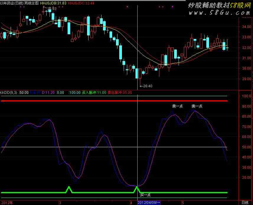 {N 2 90 9 M 2 30 3} 50; LOWV:=LLV(LOW,N); HIGHV:=HHV(HIGH,N); RSV:=EMA((CLOSE-LOWV)/(HIGHV-LOWV)*100,M); K:EMA(RSV,M),COLORFF0000; D:MA(K,M); 0,COLORFFFF33,LINETHICK1; DRAWTEXT(CROSS(K,10),2.5,'买一点'); DRAWTEXT(CROSS(D,80),90,'卖一点'); 100,COLORFFFF33,LINETHICK2; 买入脉冲:IF(CROSS(D,K) AND D<33,11,5),LINETHICK4,COLORGREEN; 卖出脉冲:IF(CROSS(K,D) AND K>80,90,95),LINETHICK4,COLORRED; |