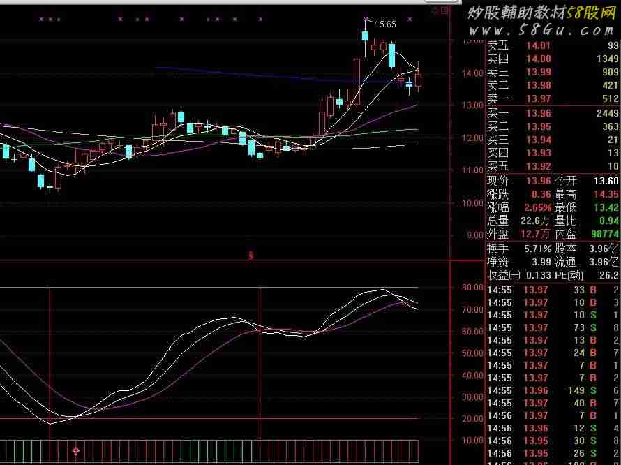 神奇指标,独家测算底部起涨点,准确率超95%,真正体现“指标不是万能,没有指标是万万不能”。指标出现红色柱子就是买入机会,闭上眼睛等上涨。Q_1:=C-REF(C,1); Q_2:=100*EMA(EMA(Q_1,6),6)/EMA(EMA(ABS(Q_1),6),6); Q_3:=CROSS(EMA(C,19),EMA(C,7)); Q_4:=CROSS(EMA(C,7),EMA(C,19)); Z1:=L=LLV(L,BARSLAST(Q_3)+1); Z2:=LLV(L,BARSLAST(Q_3)+1); Z3:=H=HHV(H,BARSLAST(Q_4)+1); Z4:=HHV(H,BARSLAST(Q_4)+1); Q_A:=DRAWLINE(Z1,Z2,Z3,Z4,0); Y1:=H=HHV(H,BARSLAST(Q_4)+1); Y2:=HHV(H,BARSLAST(Q_4)+1); Y3:=L=LLV(L,BARSLAST(Q_3)+1); Y4:=LLV(L,BARSLAST(Q_3)+1); Q_B:=DRAWLINE(Y1,Y2,Y3,Y4,0); X1:=LLV(Q_2,2)=LLV(Q_2,7) ; X2:=COUNT(Q_2<0,2); X3:=CROSS(Q_2,MA(Q_2,2)); X4:=REF(Q_B,1)<REF(Q_B,2); X5:=Q_A>REF(Q_B,1); 买进:=(X1 AND X2 AND X3) AND X4 AND X5; TJ:=IF(Q_B<REF(Q_B,1) AND Q_B=Q_A,1,0); 堪称一绝:IF(REF(TJ,1)=0 AND TJ>=1,80,10),STICK,COLORRED; 持币:IF(Q_B<REF(Q_B,1) AND Q_B=Q_A,0,10),STICK,COLORGREEN;
