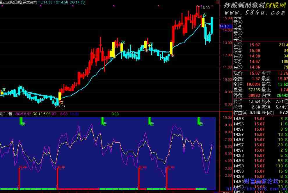 相当精准的指标,短线按短牛买卖指示操作,短牛和大牛或者短牛和中牛同时发出信号,信号更加精准,信号不多,但是相当好用! 发出信号后,再结合RSI,低位RSI5上穿RSI10,就更加准确了。 绝无未来函数,自己用了一段时间,收益还是不错的。 {横扫天下} N1:=5;N2:=10; STICKLINE(C>0,0,10,15,0),COLOR781816; LC:=REF(CLOSE,1); RSI5:SMA(MAX(CLOSE-LC,0),N1,1)/SMA(ABS(CLOSE-LC),N1,1)*10,COLORFF00FF,LINETHICK1; RSI10:SMA(MAX(CLOSE-LC,0),N2,1)/SMA(ABS(CLOSE-LC),N2,1)*10,COLOR00FFFF; VAR1:=C-REF(C,1); VAR2:=100*EMA(EMA(VAR1,6),6)/EMA(EMA(ABS(VAR1),6),6); MA5:=EMA(C,5); MA13:=EMA(C,13); UP:=DRAWLINE(L=LLV(L,BARSLAST(CROSS(MA13,MA5))+1),LLV(L,BARSLAST(CROSS (MA13,MA5))+1),H=HHV(H,BARSLAST(CROSS(MA5,MA13))+1),HHV(H,BARSLAST(CROSS (MA5,MA13))+1),0),COLOR0000FF; DOWN:=DRAWLINE(H=HHV(H,BARSLAST(CROSS(MA5,MA13))+1),HHV(H,BARSLAST(CROSS (MA5,MA13))+1),L=LLV(L,BARSLAST(CROSS(MA13,MA5))+1),LLV(L,BARSLAST(CROSS (MA13,MA5))+1),0),COLOR00FF00; BT:(LLV(VAR2,2)=LLV(VAR2,7) AND COUNT(VAR2<0,2) AND CROSS(VAR2,MA(VAR2,2))) AND REF(DOWN,1)<REF(DOWN,2) AND UP>REF(DOWN,1); 0,COLORFF00FF; 10,COLORFF0000; STICKLINE(UP,0,0.2,3,0),COLOR0000FF; STICKLINE(DOWN,0,0.2,3,0),COLOR00FF00; STICKLINE(BT,0,3,2,0),COLOR000088; STICKLINE(BT,0,3,1,0),COLOR0000CC; STICKLINE(BT,0,3,0.22,0),COLOR0000FF; DRAWTEXT(BT,3,'短牛'),COLOR0000FF; TJ1:=REF(DOWN,1)<REF(DOWN,2) AND UP>REF(DOWN,1) AND C<HHV(H,21)*0.82; STICKLINE(TJ1,0,2,3,0),COLOR880088; STICKLINE(TJ1,0,2,1.5,0),COLORAA00AA; STICKLINE(TJ1,0,2,0.8,0),COLORCC00CC; STICKLINE(TJ1,0,2,0.2,0),COLORFF00FF; DRAWTEXT(TJ1,2,'中牛'),COLORFF00FF; HR:=HHV(HIGH,55); HRY:=LLV(LOW,55); HRY11:=HR*HRY; HRY33:=SQRT(HRY11); TJ2:=REF(DOWN,1)<REF(DOWN,2) AND UP>REF(DOWN,1) AND C<HRY33; STICKLINE(TJ2,0,1,5,0),COLOR008888; STICKLINE(TJ2,0,1,2,0),COLOR00AAAA; STICKLINE(TJ2,0,1,1,0),COLOR00CCCC; STICKLINE(TJ2,0,1,0.2,0),COLOR00FFFF; DRAWTEXT(TJ2,1,'大牛'),COLOR00FFFF; ST:=REF(UP,1)>REF(UP,2) AND DOWN<REF(UP,1); STICKLINE(ST,10,9,5,0),COLOR008800; STICKLINE(ST,10,9,2,0),COLOR00AA00; STICKLINE(ST,10,9,1,0),COLOR00CC00; STICKLINE(ST,10,9,0.2,0),COLOR00FF00; DRAWTEXT(ST,9,'卖'),COLOR00FF00; |