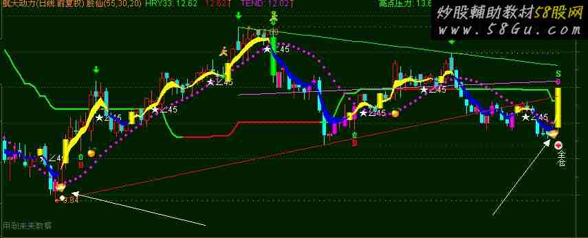 DD:=TEND>REF(TEND,1) AND REF(TEND,1) >REF(TEND,2);{趋势线向上转折} GG2:=CROSS(WLT1,TEND);{均线与趋势线向上金叉} HRY1:=LLV(LOW,55); HRY2:=HHV(HIGH,21); GG3:=C<HRY2*0.8 AND C>HRY33;{股价高于牛熊线,低于21日内最高价的80%} JJ1:=C<HRY1*1.62; TJ1:=GG1;{均线向上金叉} TJ2:=GG2 AND JJ1; TJ3:=GG1 AND GG3 ; XG:=TJ1OR TJ3 ; XG2:=C<HRY2*0.86 OR LB>1; XG1:=XG AND XG2 AND C>HRY33 AND JLP; XG3:=XG AND C<HHV(HIGH,250)*0.3; XG11:=XG1 OR XG3; DRAWICON(XG11,LOW*0.97,23); DRAWTEXT(XG1,LOW*0.95,'全'),COLORFFFFFF; DRAWTEXT(XG1,LOW*0.93,'仓'),COLORFFFFFF; SAL1:=HIGH>超买; SAL2:=C<O AND (O-C)/C>0.03; QQ:= C<WLT2; QQ1:=CROSS(WLT2,WLT1); QQ3:=HIGH>HRY1*1.38; SAL01:= SAL1 AND SAL2 AND QQ AND QQ3; SAL02:=QQ3 AND QQ1; SAL:=SAL01 OR SAL02; DRAWICON(SAL,HIGH*1.03,15); {红色K线,持股} STICKLINE(C>TEND AND C>O,C,O,3,1),COLOR0000FF; STICKLINE(C>TEND AND C<O,C,O,3,1),COLOR0000FF; STICKLINE(C>TEND AND C<O,C,O,1.7,0),COLORDDDD00; {兰色K线,持币} STICKLINE(C<TEND AND C<WLT1 AND C>O,C,O,3,1),COLORFFFF00; STICKLINE(C<TEND AND C<WLT1 AND C>O,C,O,1.7,0),COLOR6800FD; STICKLINE(C<TEND AND C<WLT1 AND C>O,L,H,0,0),COLOR0000FF; {紫色K线,注意} STICKLINE(C<TEND AND C>WLT1 AND C>O,C,O,3,0),COLORAA00AA; STICKLINE(C<TEND AND C>WLT1 AND C>O,C,O,1,0),COLORDD00DD; STICKLINE(C<TEND AND C>WLT1 AND C>O,C,O,0.3,0),COLORFF00FF; {黄色K线,注意买入} STICKLINE(XG,C,O,4,0),COLOR009999; STICKLINE(XG,C,O,3,0),COLOR00BBBB; STICKLINE(XG,C,O,1.5,0),COLOR00DDDD; STICKLINE(XG,C,O,0.3,0),COLOR00FFFF; {绿色K线,卖出} STICKLINE(SAL,C,O,4,0),COLOR009900; STICKLINE(SAL,C,O,3,0),COLOR00BB00; STICKLINE(SAL,C,O,1.5,0),COLOR00DD00; STICKLINE(SAL,C,O,0.3,0),COLOR00FF00; DRAWBAND(WLT1,RGB(255,255,0),WLT2,RGB(0,0,220));