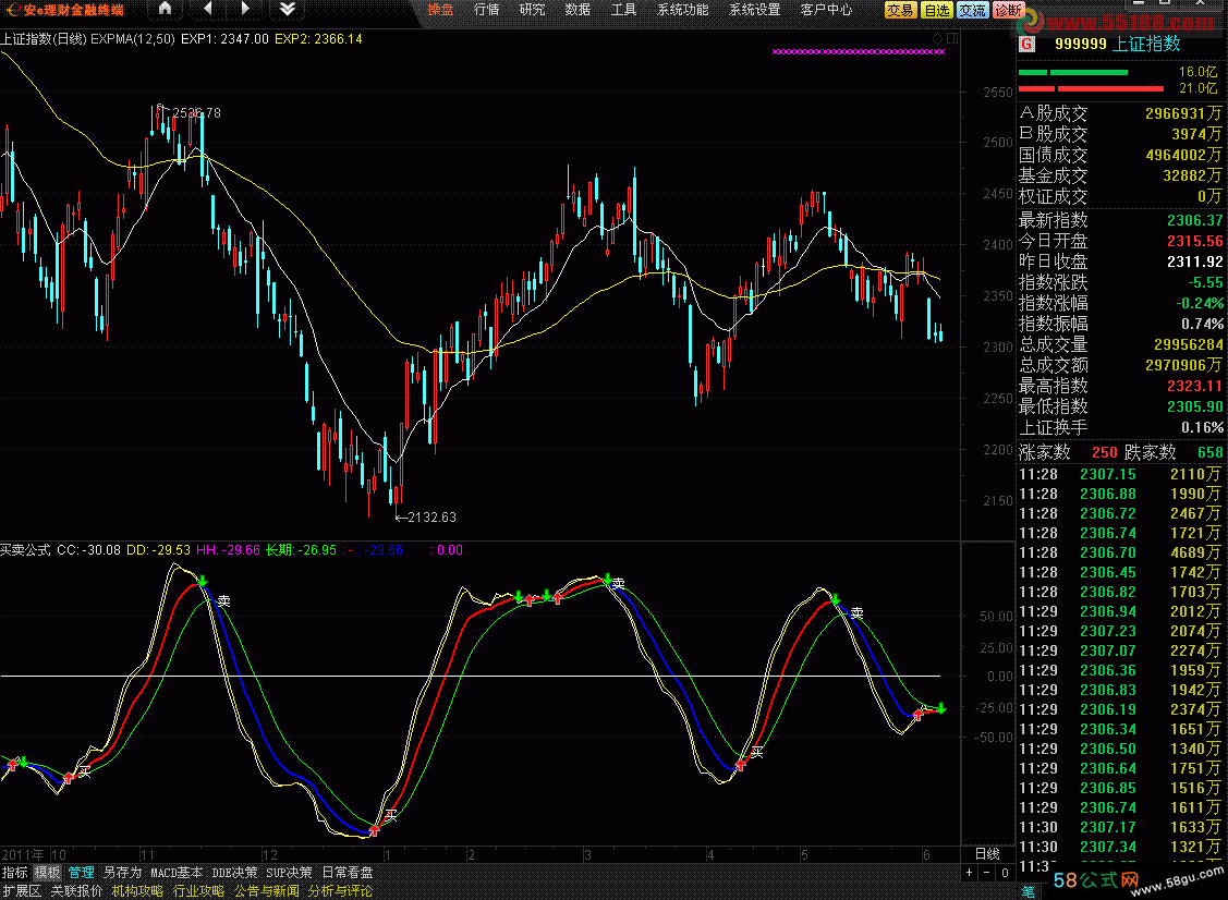 这是自用的一个指标(无未来函数),出现红箭头买,绿箭头卖。当在一个较高位发出'卖'时,应坚决卖,在长期下跌后期,发出‘买’时,应及时买进。配合周线、月线效果更见明显。 {买卖公式}AA:=(2*C+HIGH+LOW)/4; BB:=AA-REF(C,12); CC:EMA(BB,13); DD:EMA(CC,2); EE:=EMA(BB,34); FF:=EMA(BB,55); GG:=EMA(DD,3),COLORGREEN; HH:EMA(CC,7); 长期:EMA(HH,7); IF(HH>REF(HH,1),HH,DRAWNULL),COLORRED,LINETHICK2; IF(HH<REF(HH,1),HH,DRAWNULL),COLORBLUE,LINETHICK2; DRAWICON(HH>REF(HH,1) AND REF(HH,1)<REF(HH,2),HH*0.99,1); DRAWICON(HH<REF(HH,1) AND REF(HH,1)>REF(HH,2),HH*1.01,2); DRAWTEXT(CROSS(长期,HH),长期*1.01,'卖'); DRAWTEXT(CROSS(HH,长期),HH*0.99,'买'); 0;