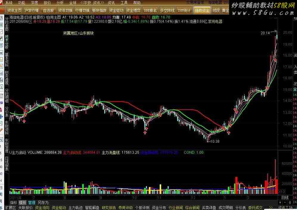 特发自用短线强势波段主图(主图、附图、简要说明)简要说明: 1、本指标专做短线强势波段。 2、箭头出现表示该日量能饱和度为100,尤其关注低位出现和突破位的箭头。 3、指标简明易懂,大家一看便明白,不用多说。 4、我一直用的主图,天天做短线,只赚不亏。 I自用主图A1:EMA(C,3),COLORWHITE; A2:EMA(C,5),COLORYELLOW; A3:EMA(C,7),COLORMAGENTA;均衡:EMA(A2,5),COLORWHITE; 中轨:HHV(MA(H,13),13),COLORRED,LINETHICK2; 趋势:LLV(MA(H,13),1),COLORGREEN,LINETHICK2;SAT:=((AMOUNT/C)/(HHV(AMOUNT,20)/HHV(C,20)))*100; 量能饱和:=IF(SAT<-20,-20,IF(SAT>100,100,SAT)),DOTLINE,COLORWHITE,LINETHICK1; DRAWICON(量能饱和=100,L*0.98,1);DRAWTEXT_FIX(1,0.20,0,0,'所属地区:')COLOR00FFFF; DRAWTEXT_FIX(1,0.26,0,0,DYBLOCK)COLOR00FFFF; |